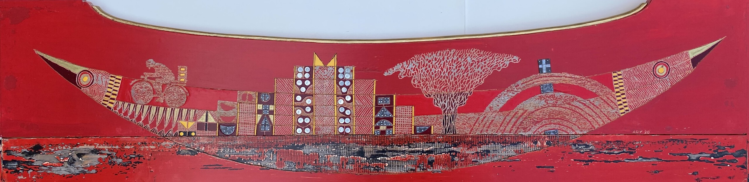 Kastplank met originele rode kleur, halronde uitsparing aan de voorzijde en goudkleurige kraal. Bewerkt met zaagje, priem, metaalpen en schuurpapier. Toegevoegd: lood en asfaltspijkers. Extra kleuren geel, rood, donkerrood, goud en zwart.