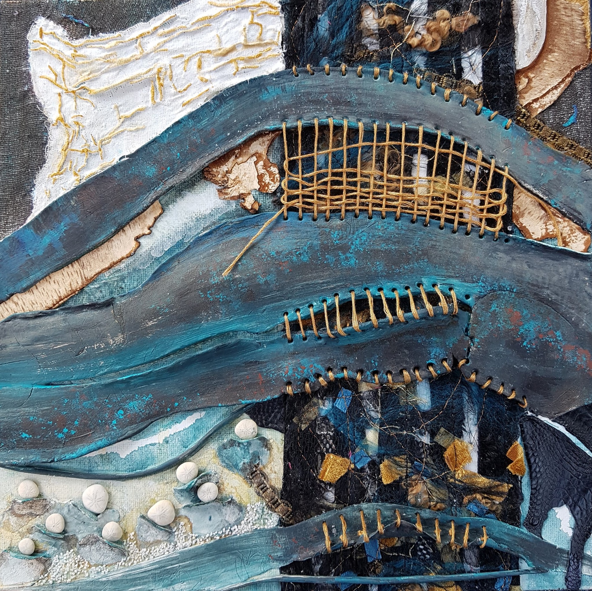 Mixed media in donkerblauw en goudkleur op canvasdoek