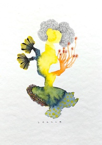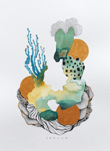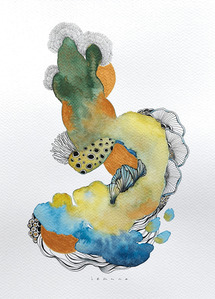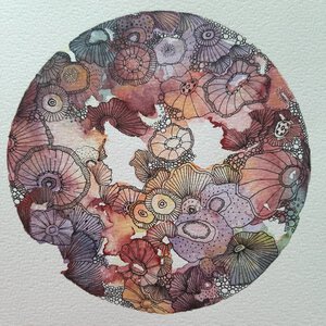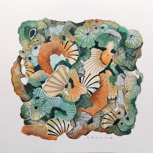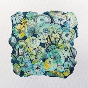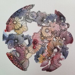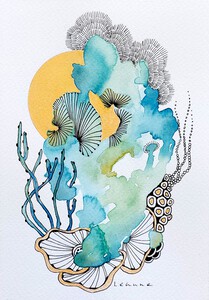 En Route. Onderweg ben ik een nieuwe weg ingeslagen. Aquarel met pentekening. Geïnspireerd op koraal, zeeleven, zentangle en doodles. Kleinere werken op papier, met grootse impact.