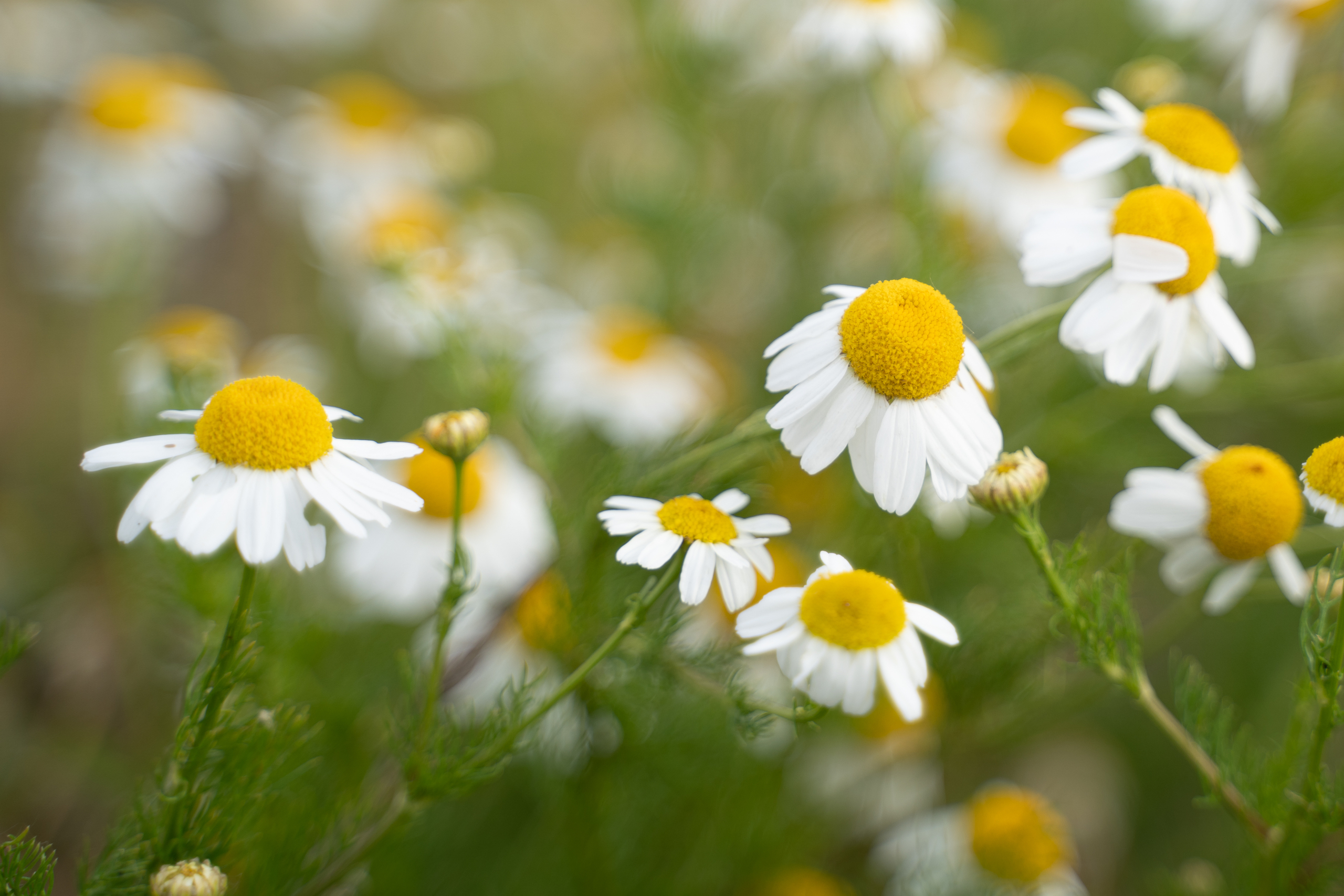 Kamille in het landschap, gefotografeerd met een kleine scherpte diepte.