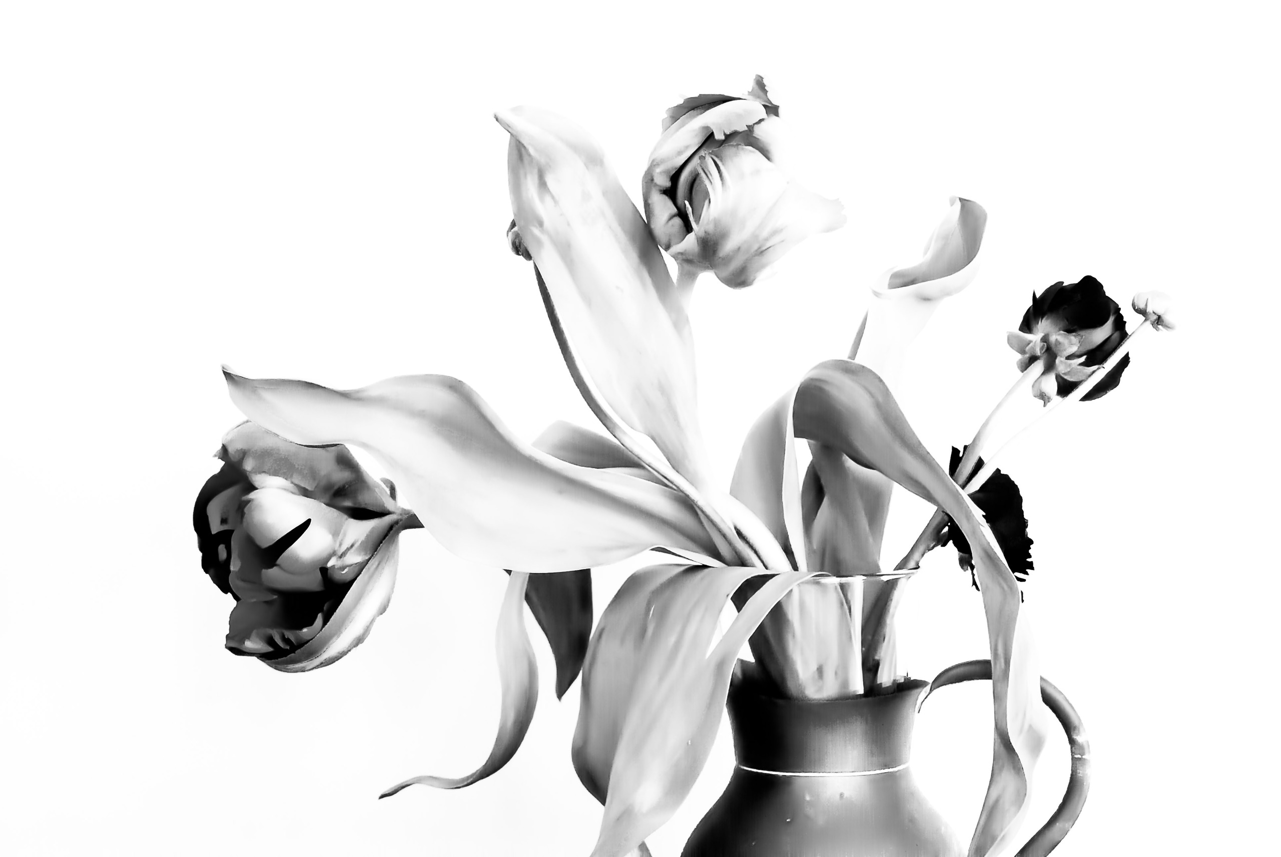 Tulpen in een zwart wit uitvoering. Een beetje overbelicht zodat de foto overgaat in de achtergrond, waardoor een beetje een high key achtige foto ontstaat.