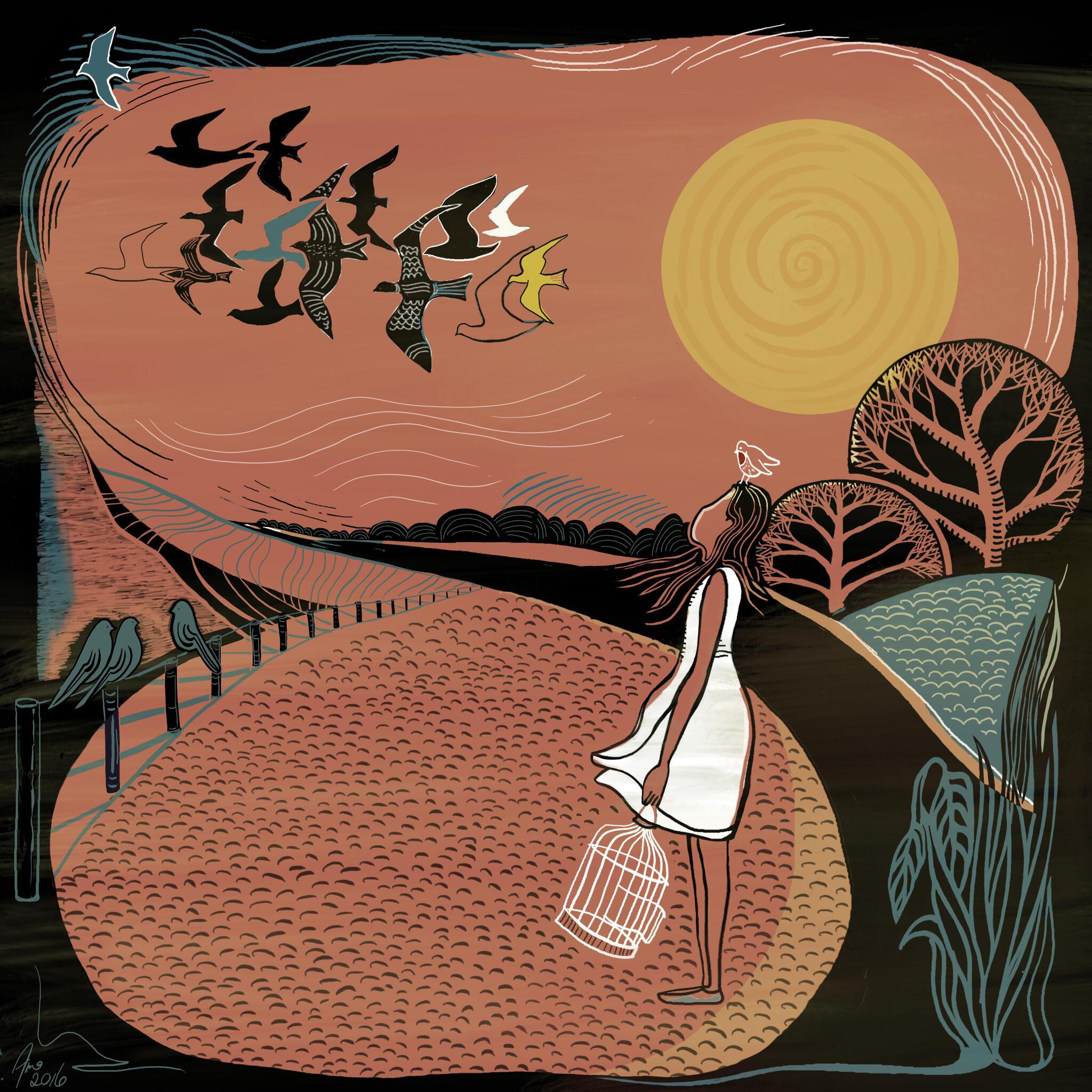 Rood Landschap Vogel Kind Liefde Loslaten Vrijheid Illustratie Kooi