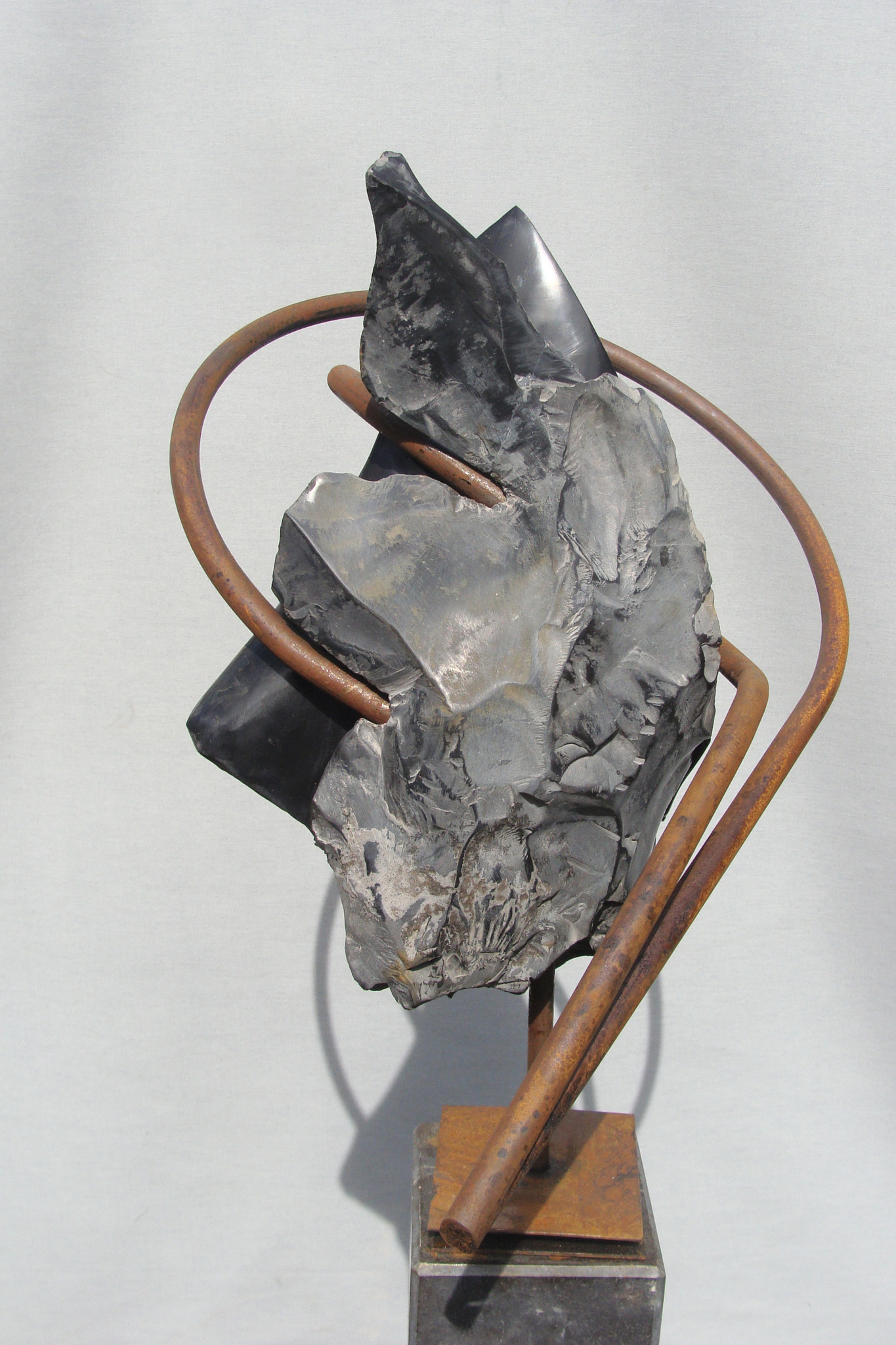 Hans van Uden werkt met harde natuursteen waarbij het een deel van de oorspronkelijke steen laat bestaan . Daarnaast combineert hij steen met Kortenstaal