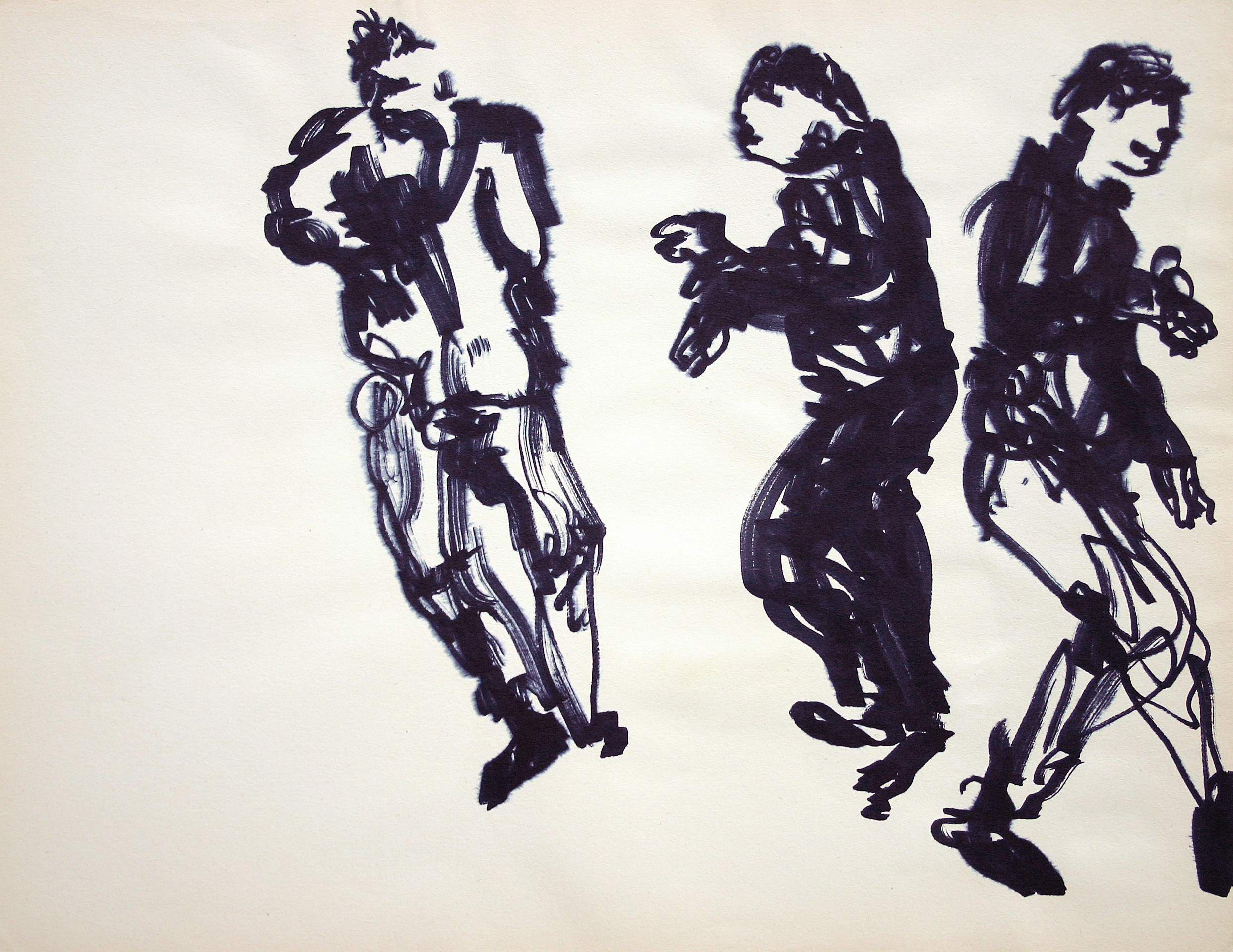 Drie figuren, schets met marker en alcohol op papier.