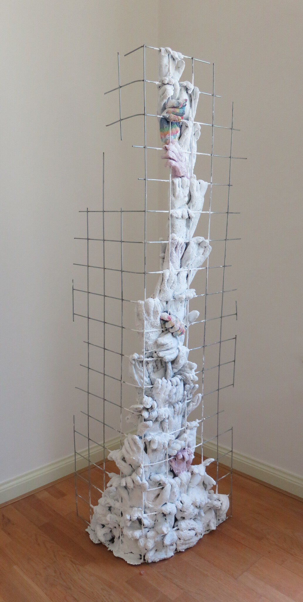 Sculptuur van oude handschoenen, ijzer, gesso, garen.