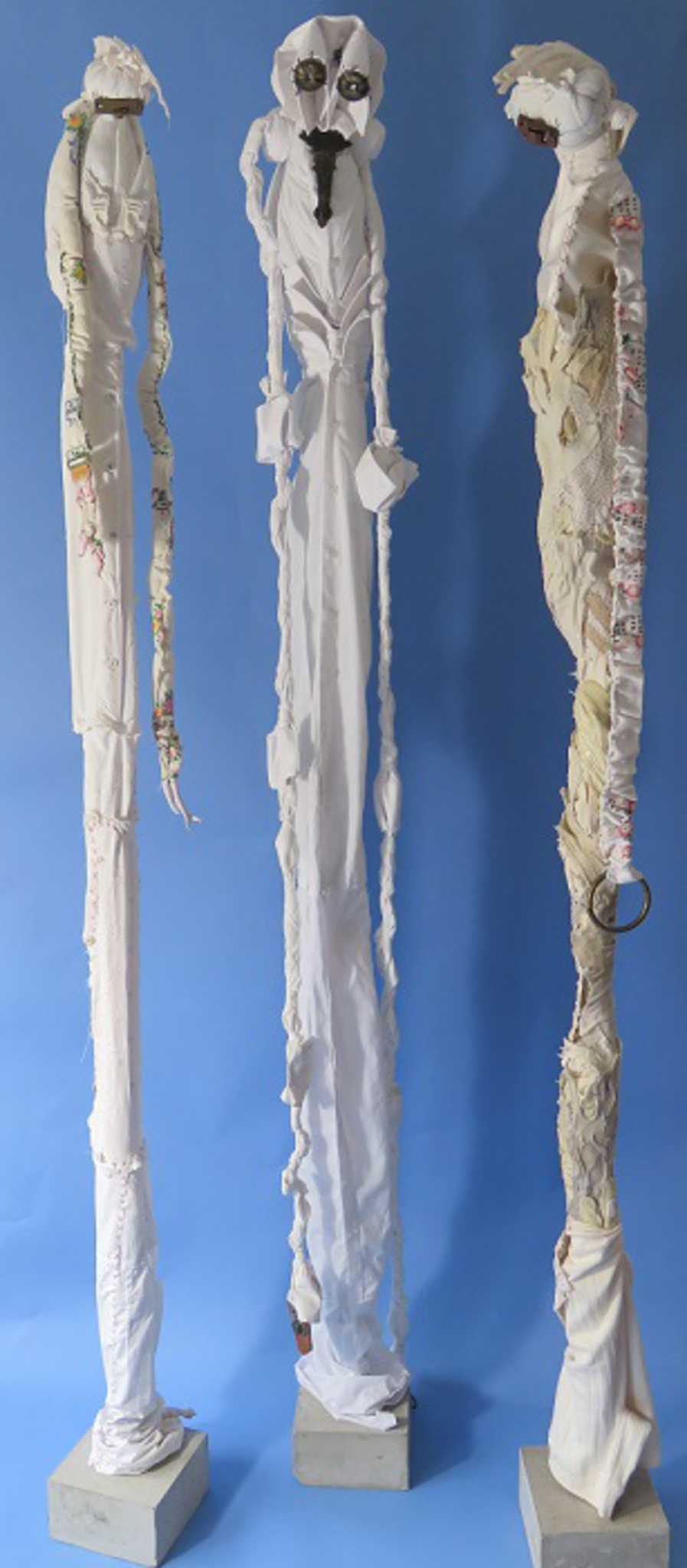 Sculpturen, genaaid, van vintage textiel, fournituren, ijzer, beton, hout. Per stuk te koop.