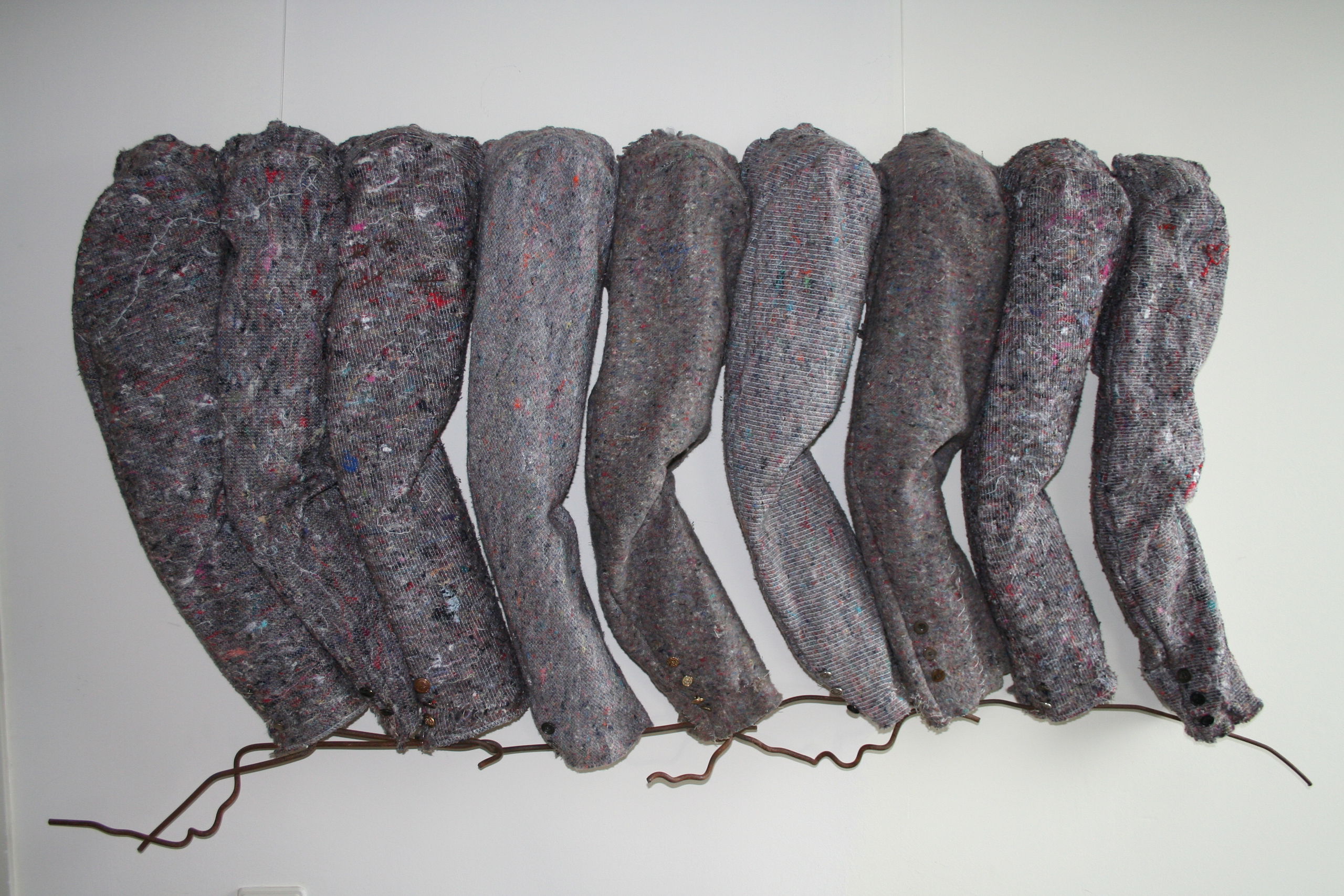 Hangende sculptuur, genaaid van vintage verhuisdekens, knopen, ijzer, hout, garen.