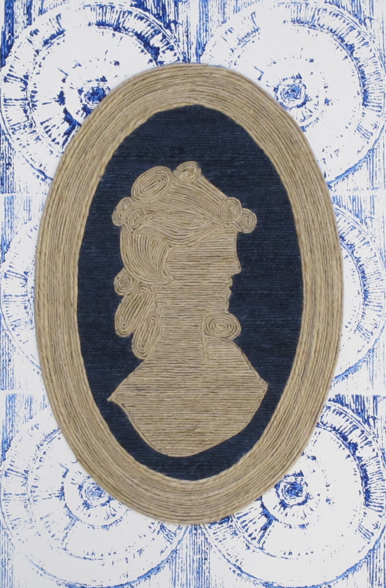 Portret van een vrouw gemaakt van vlastouw in een medallion. De rand is geprint met touwdruk.
