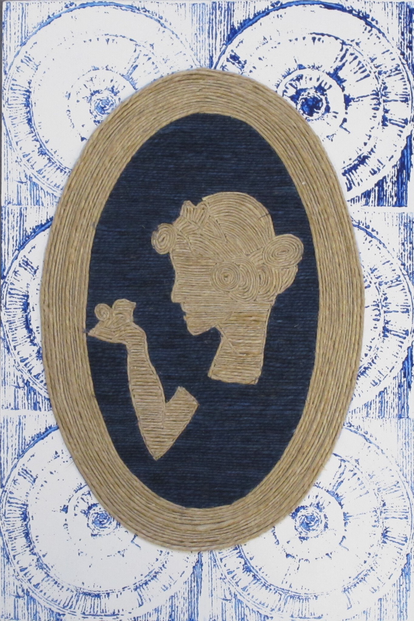Portret van een vrouw (Snowwhite) gemaakt van vlastouw in een medaillon. De rand is gedrukt met touwstempels.