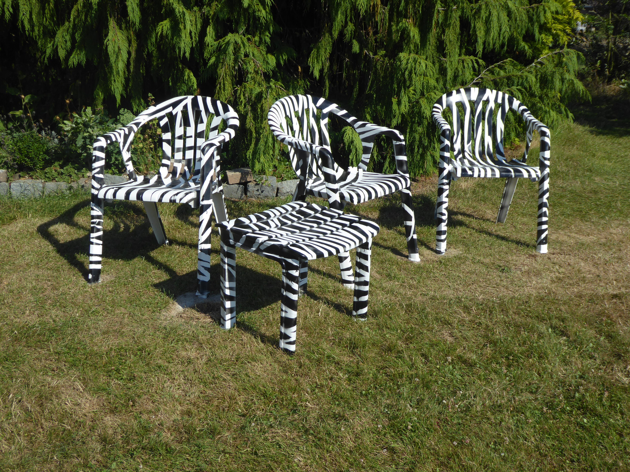 zebra's met veulen op tuinstoelen