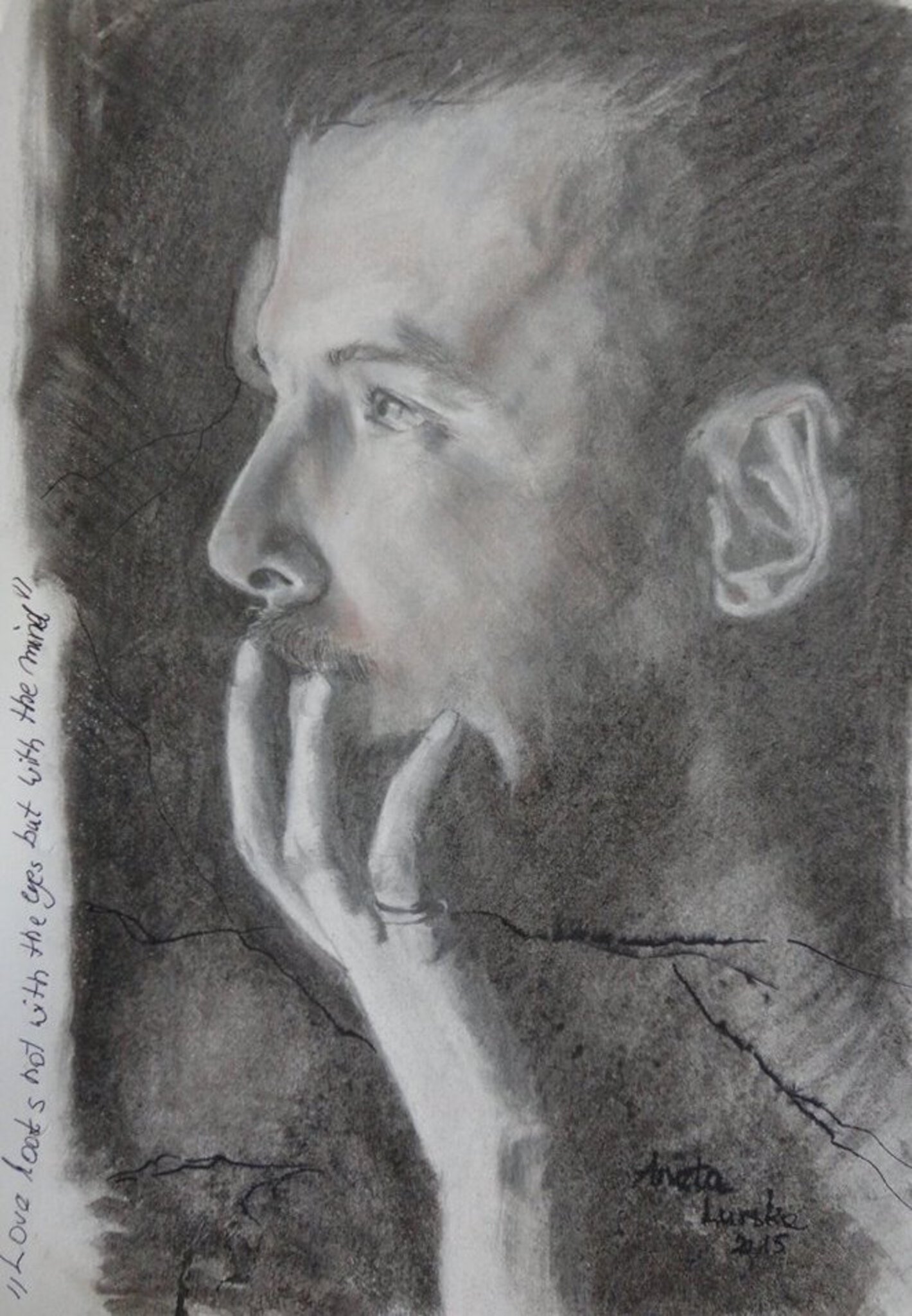 Alexander Mc Queen portret, ik was onder de indruk door het werk van deze bekende ontwerper en zijn uitspraak :"Love looks not with the eyes but with the mind" ( niet ingelijst)