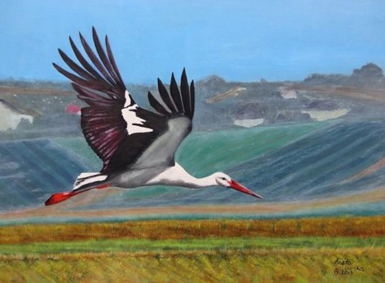 Landschap met ooievaar. NIET ingelijst