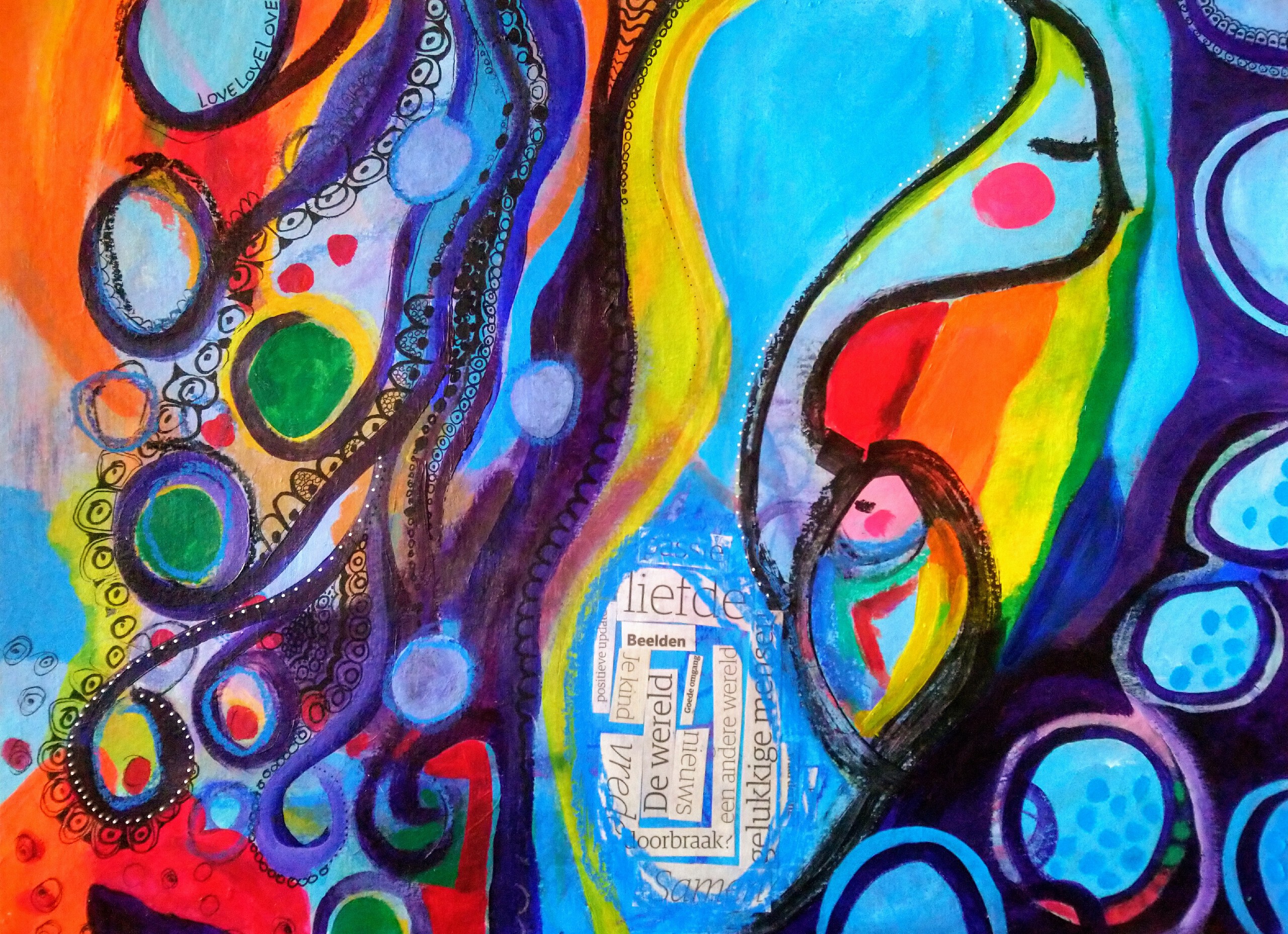 Toekomst voor inclusivitiet? Collage, krijt, acryl, pen en tekst.