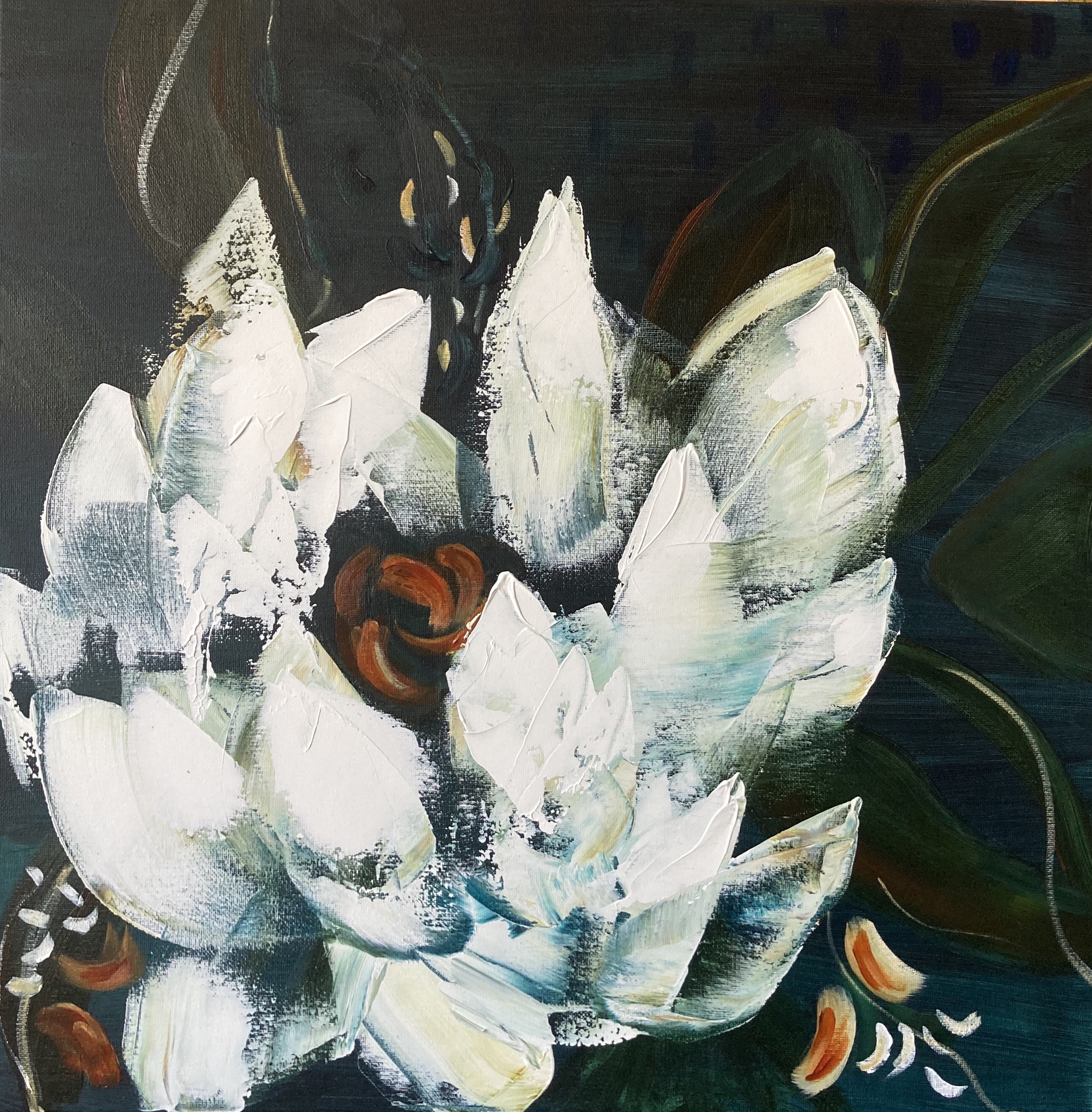 Grote bloem op donkere ondergrond, acryl.