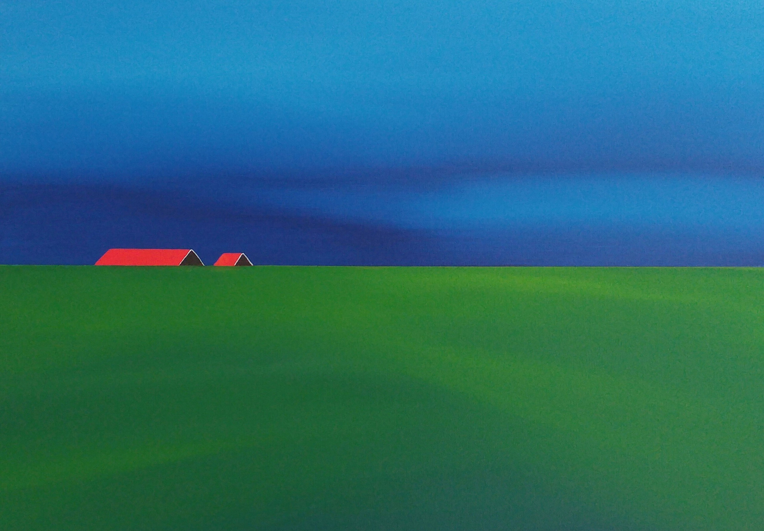 Schilderij Rood Landschap Blauw Rode Groen Van Polder Minimalistisch Dijk Boerderij Daken Nelly Nieuwenhuijzen