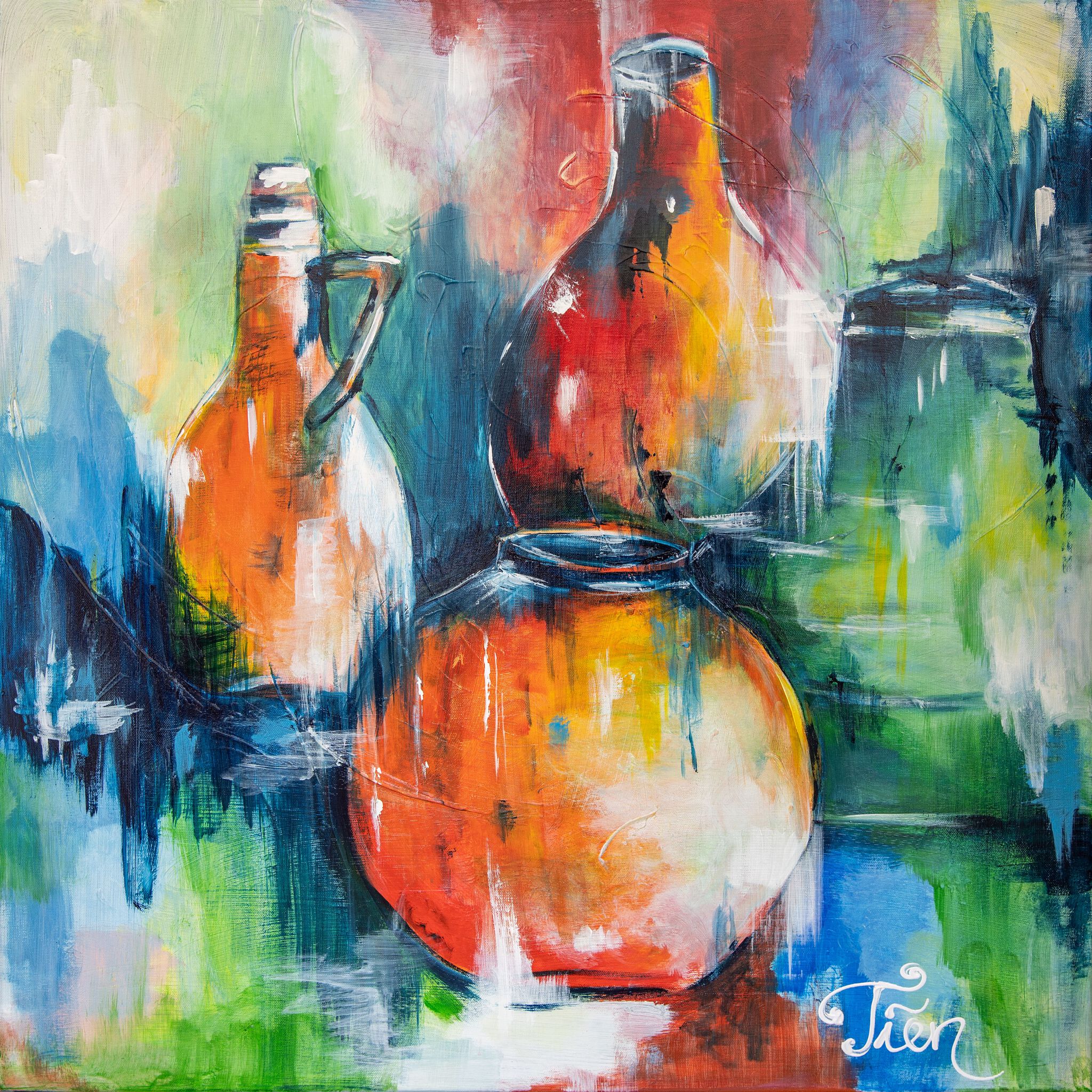 Drie vazen drie vazen die lekker kleurrijk staan te wachten op mijn kleurige bloemwerken. In een enigszins abstracte stijl en met dikke opgebrachte acrylverf. Een veelkleurig werk en met een mooie witte lijst is het mooi geheel.