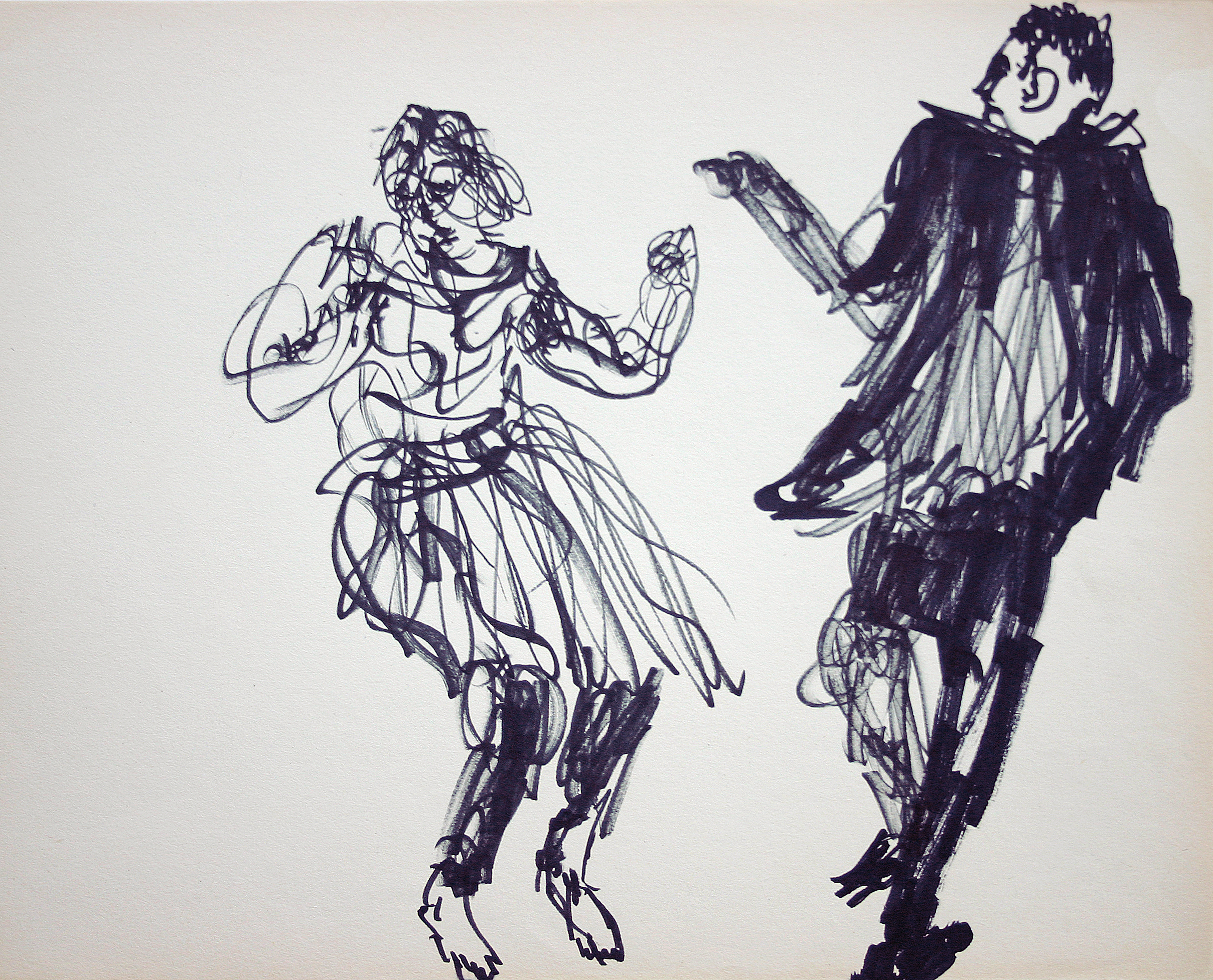 Schets van twee dansende mensen, met marker op papier.
