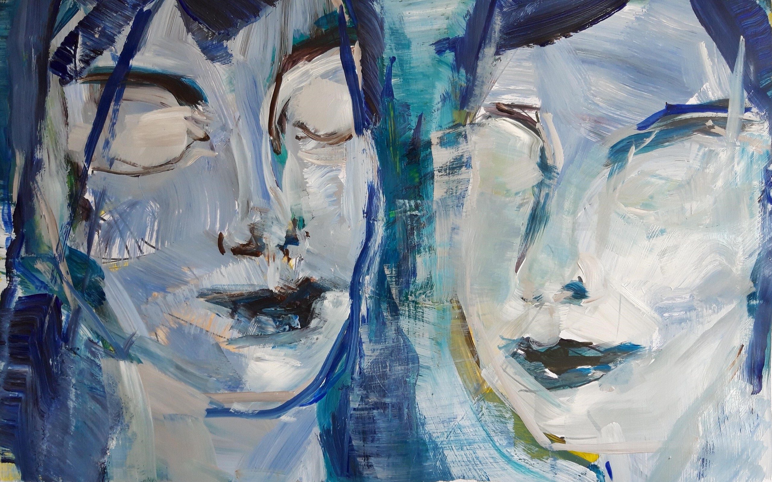 Monochrome Portret duo. Acryl en marker op papier Abstraherend en Intuïtief geschetst en geschilderd in monochrome blauw en grijs tinten