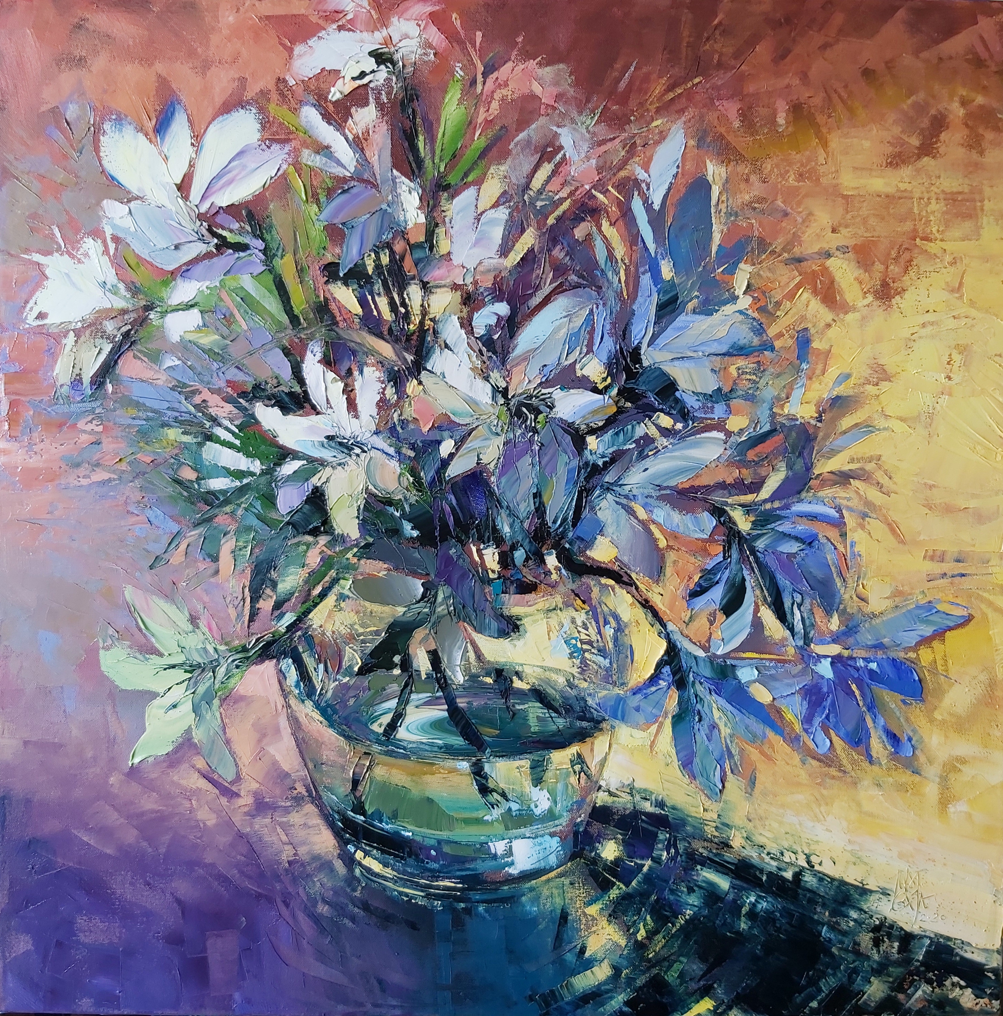 Geschilderd met schildermessen met pasteuze verf (impasto) in Alla Prima techniek. DRUK OP HET BEELD OM IN TE ZOOMEN.