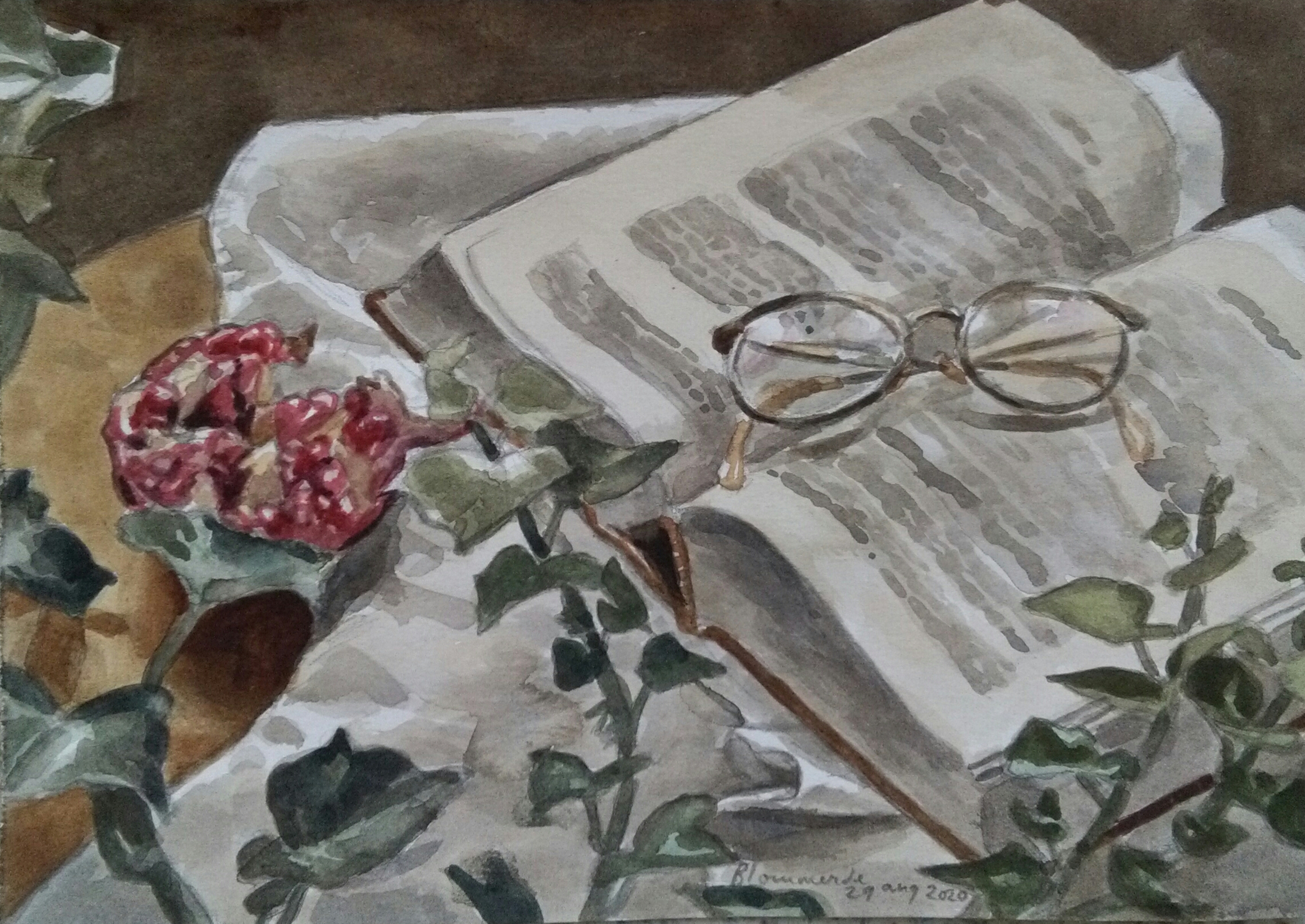 Figuratief Bril Aquarel Realistisch Stilleven Boek Granaatappel Klimop