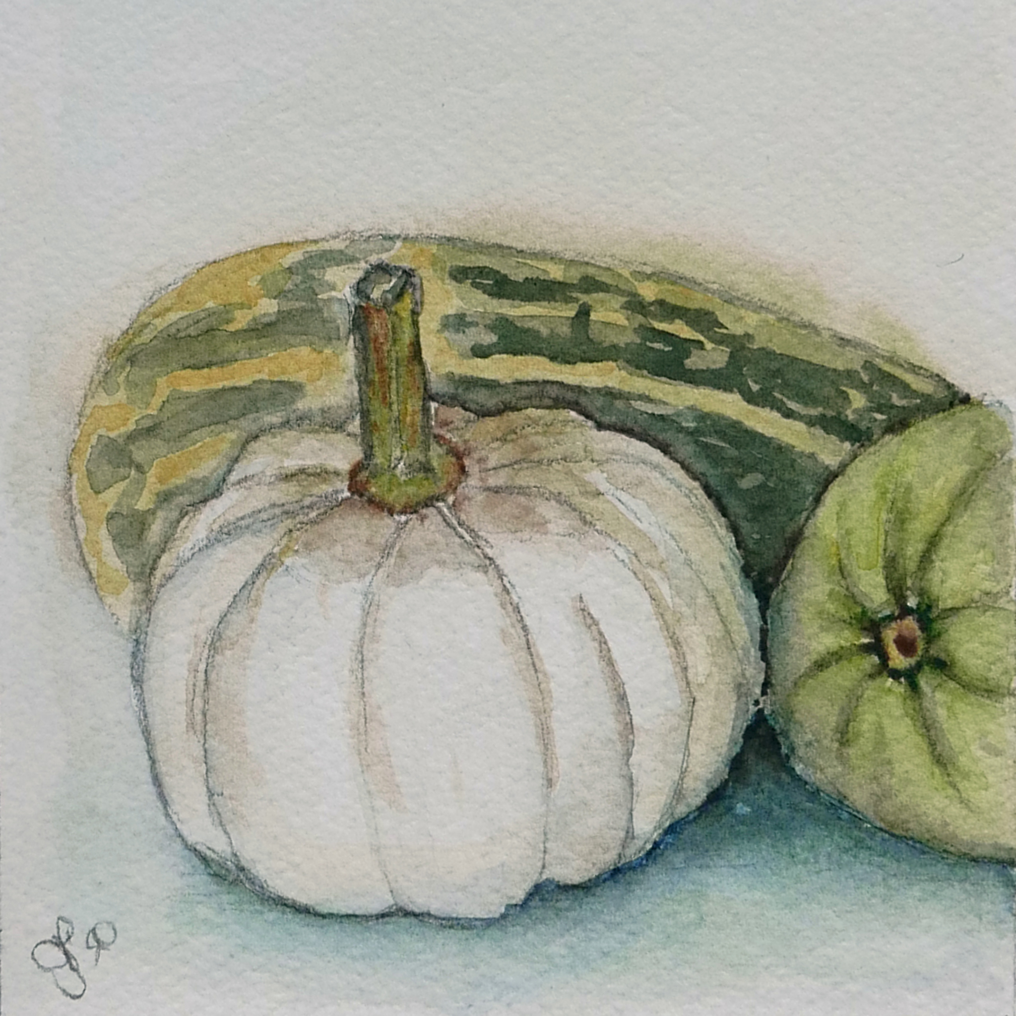 Aquarel Natuur Stilleven Herfst Watercolor Waterverf Kalebassen Pompoen Pompoenen Kalebas
