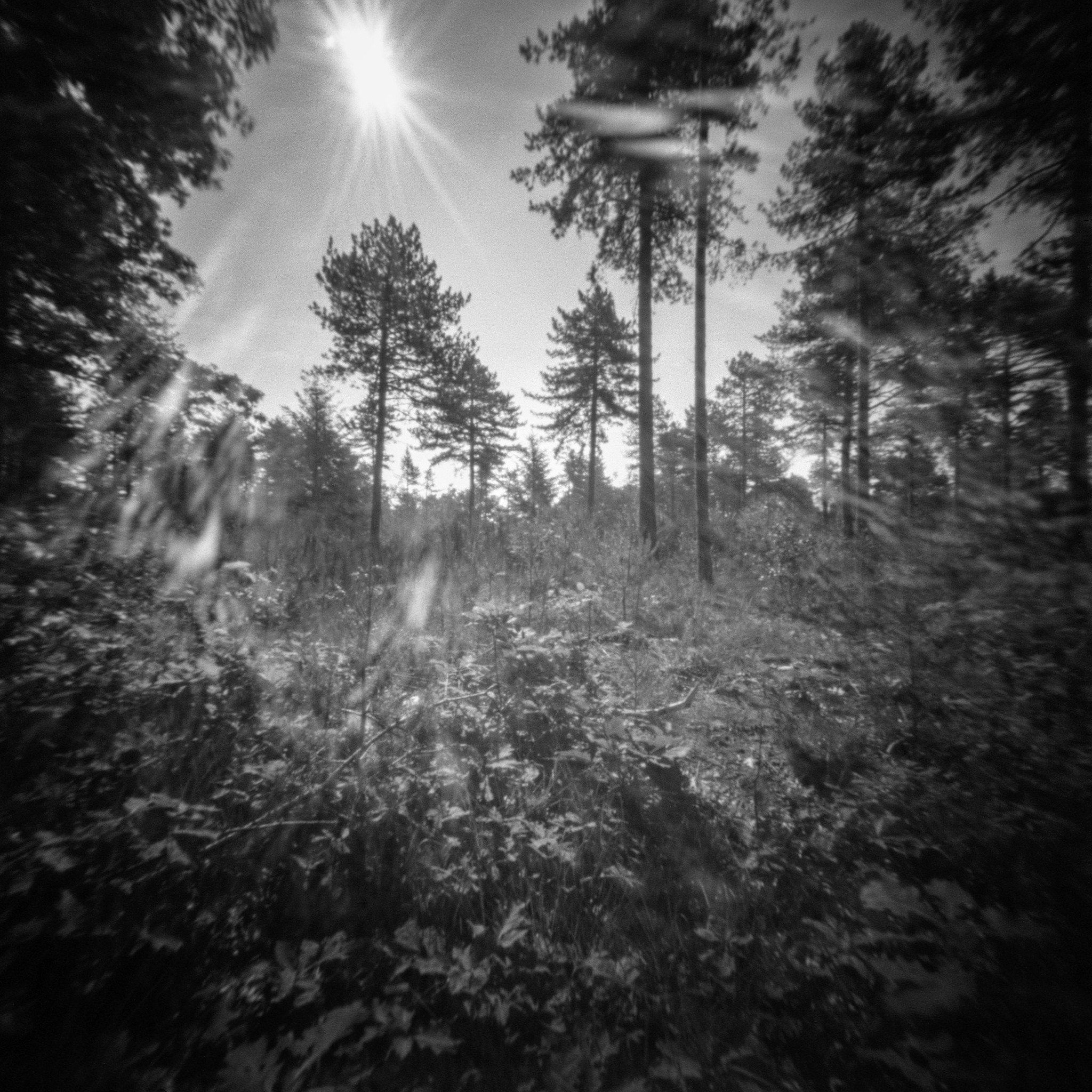 Tegenlichtopname in het Mastbos te Breda. Analoge pinhole foto.