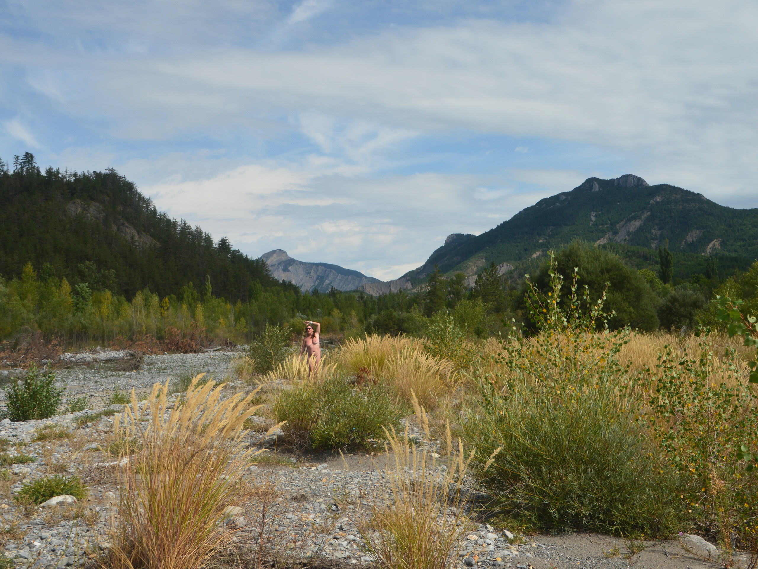 Anne geniet van de lage vegetatie in de droge rivierbodem.