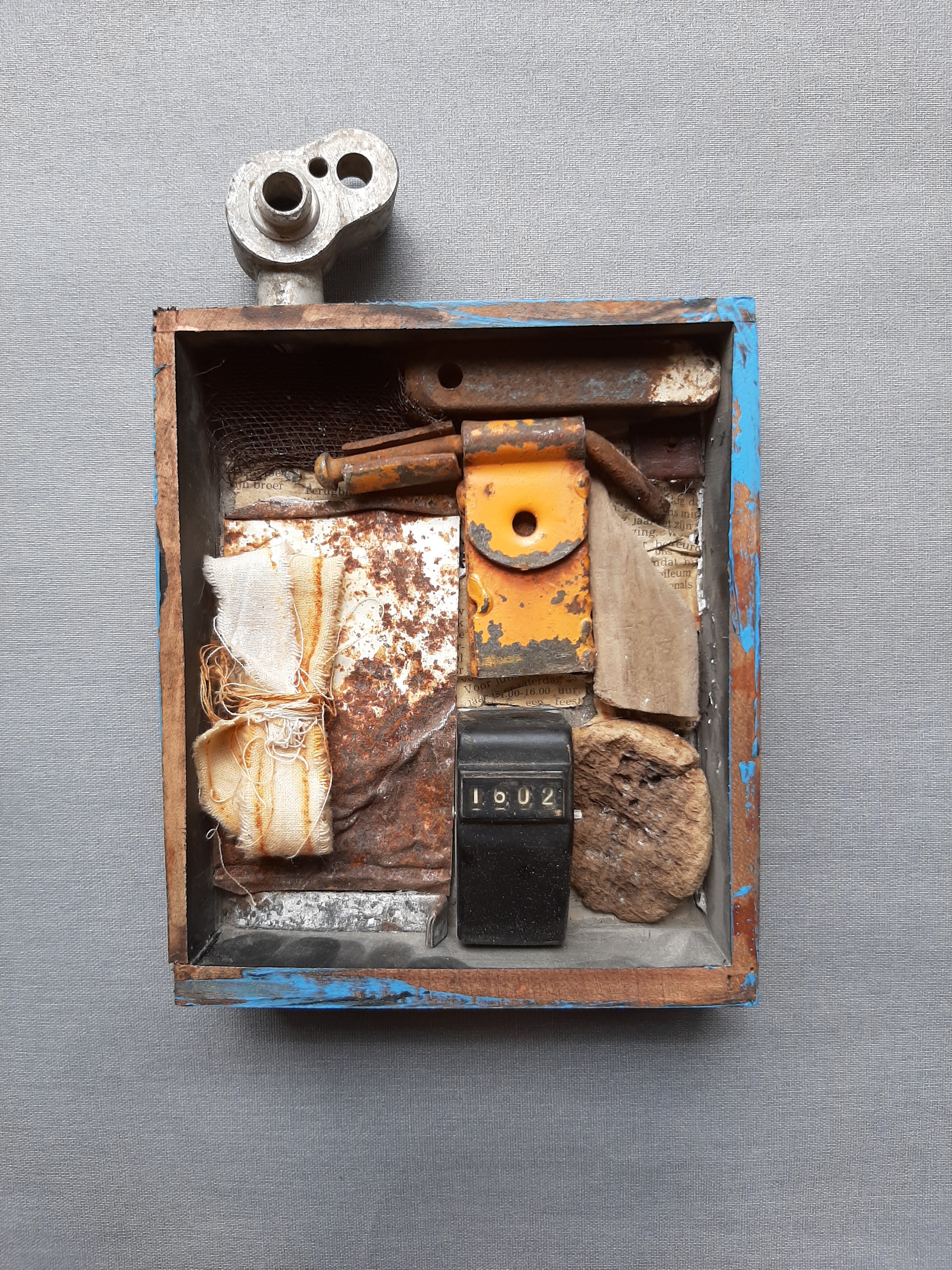 Blauw Hout Samen Metaal Bakje Ruimte Opgesloten Spullen Verzameling Kaders Ingesloten