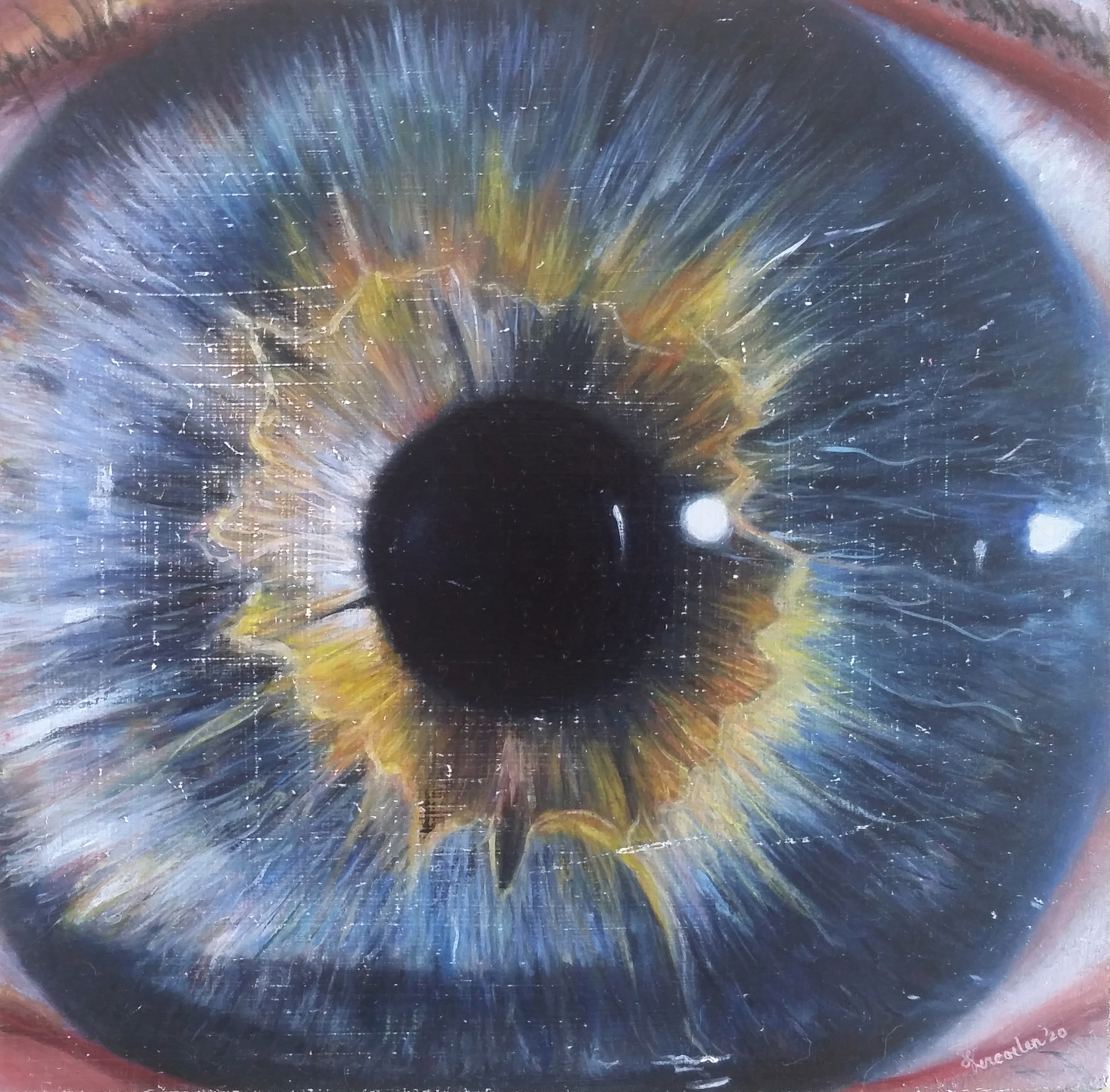 Als inspiratie op de zonnebloemen van Gogh heb ik dit oog geschilderd omdat ik in het oog een zekere zonnebloem zag. Eigen werk. Het is geschilderd op paneel.