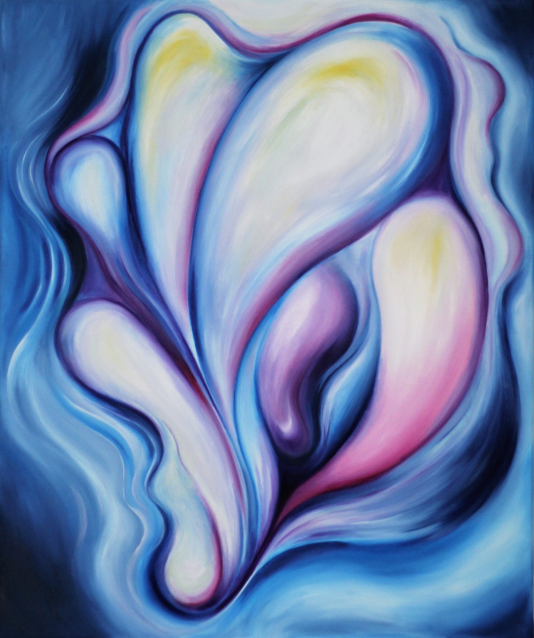 Intuïtief en geabstraheerd olieverfschilderij, geïnspireerd door de organische vormen van een oester of een schelp.