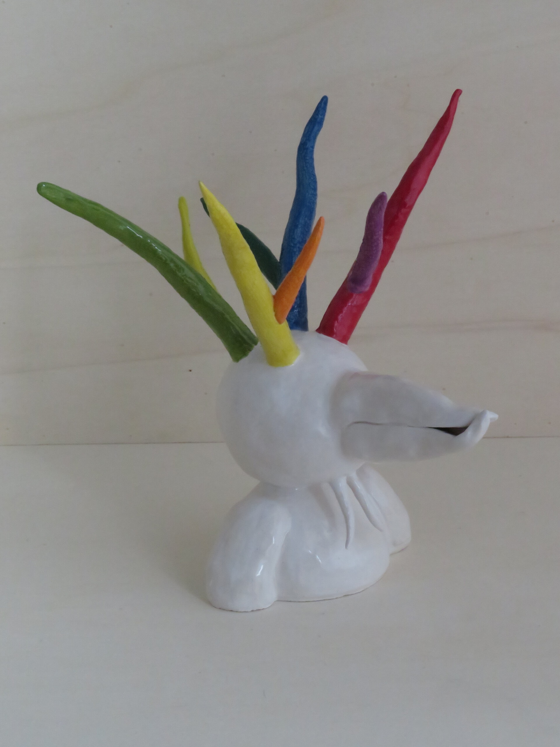 Ik ben Bianca de Leuw (1968) en woon en werk in Breda. Via sculptuur/monumentaal op de kunstacademie in Breda, vilt hoeden maken, uniek kinderspeelgoed maken, veel lessen en workshops op breed beeldend vlak ben ik bij mijn eerste liefde teruggekomen: KLEI! Ik speel in mijn werk graag met onvolkomenheid/onvolmaaktheid. Er is altijd iets wat niet klopt. Voor mij zit daar precies de schoonheid in. Dat kan heel klein zijn, een scheve neus of wat rigoureuzer, een vogelkop met een gewei op een menselijke romp of juist door toeval een barst of een scheurtje, misschien wel extra benadrukt door een afwijkend kleurtje. Ik vind het leuk om af en toe gebruiksvoorwerpen te maken en natuurlijk zijn dit dan ook geen "perfecte" vormen. Ieder ding is daarmee ook uniek en heeft zijn eigen schoonheid.