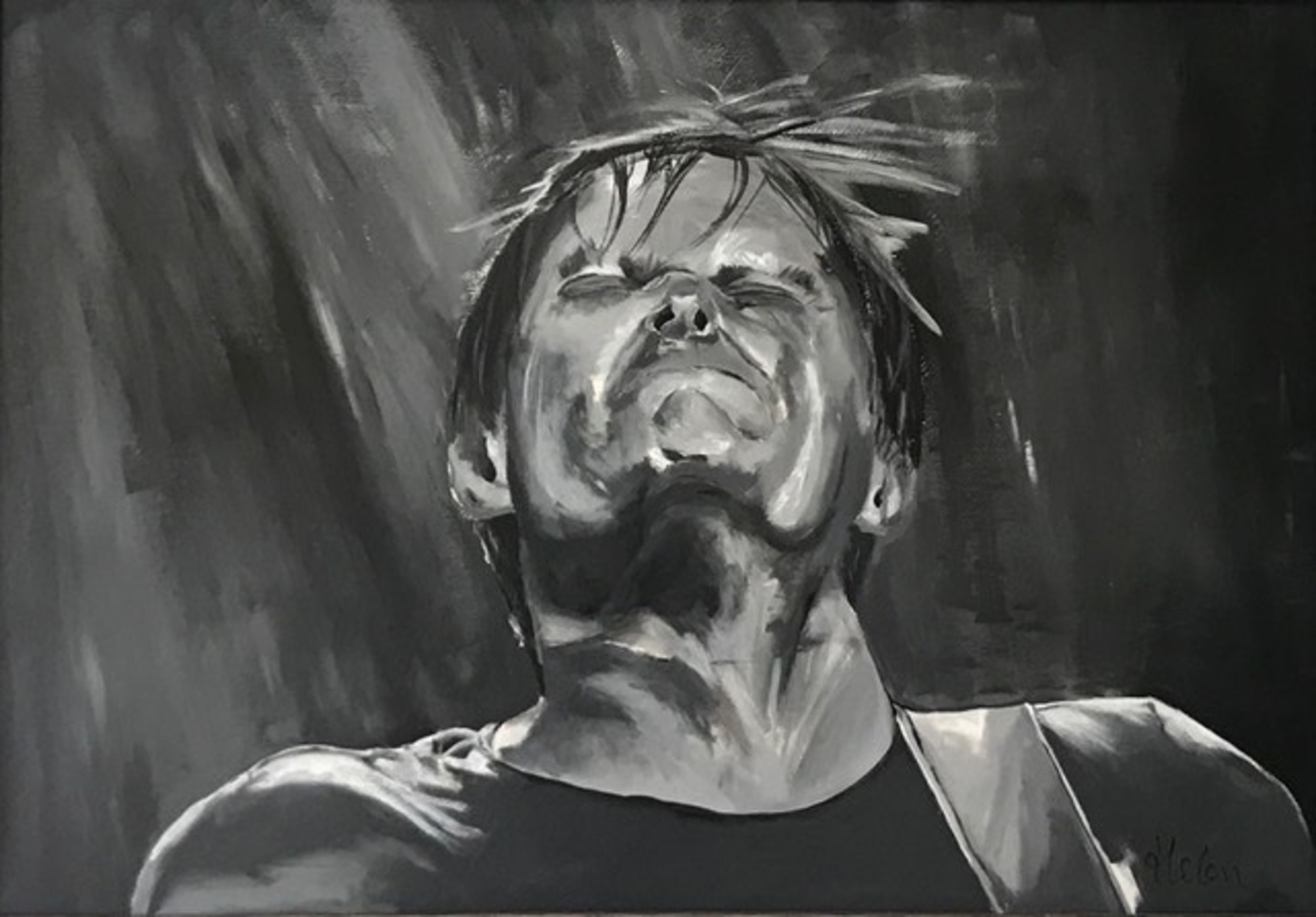 Jan Dooms, bassist, gefotografeerd door Cor Houet. Acryl papier verlijmd op glasplaat en ingelijst.