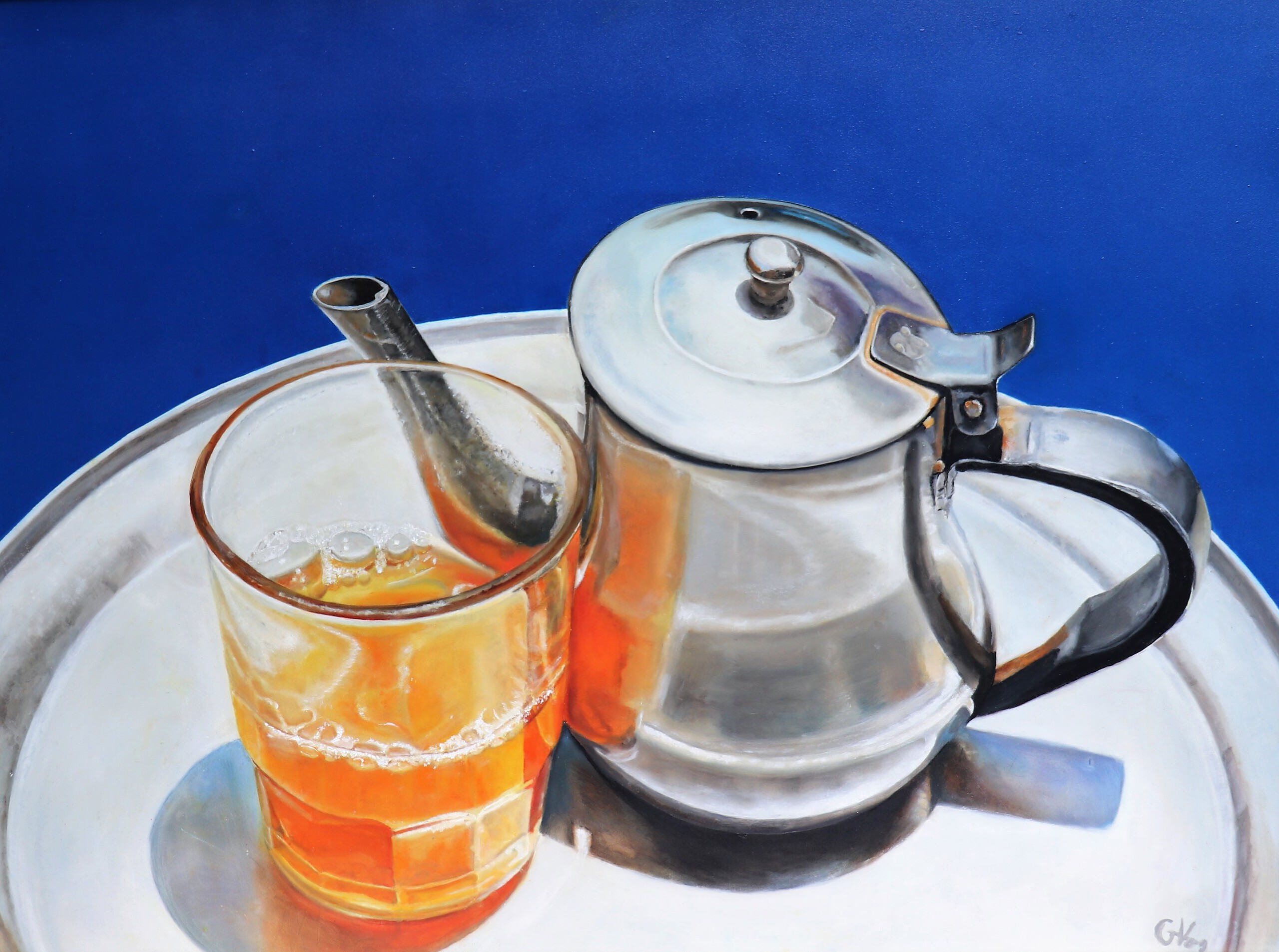Rituelen vormen het cement van hoe we uitdrukking geven aan onze hoogste waarden waarmee we ons identificeren. Dit geldt ook voor het theeritueel in Marokko. De traditionele Marokkaanse theeceremonie staat ook bekend als "Atay Nah Nah" en wordt beschouwd als de meest verfijnde uiting van gastvrijheid. Voor mij was het een bron van inspiratie om het resultaat van deze ceremonie te schilderen met het gevoel van de warmte van de zon