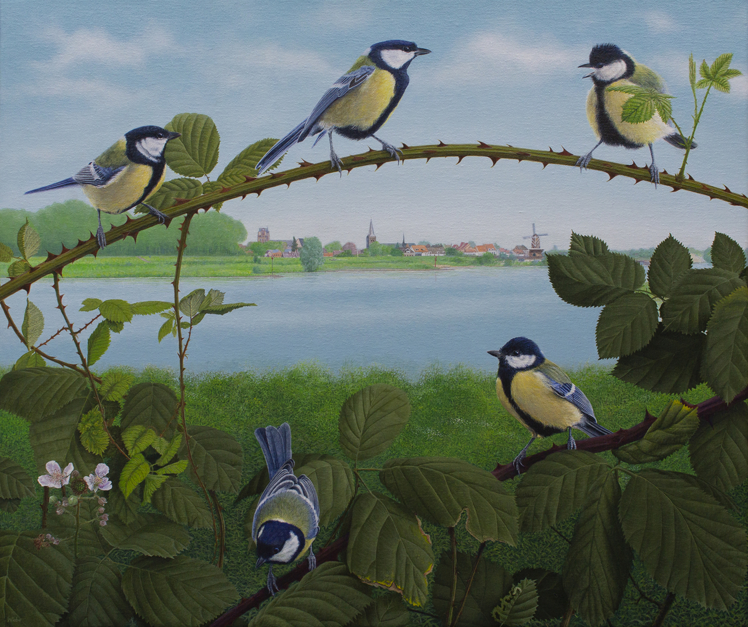De koolmezen die voor dit schilderij 'model' hebben gestaan zie/zag ik elke dag op mijn balkon.