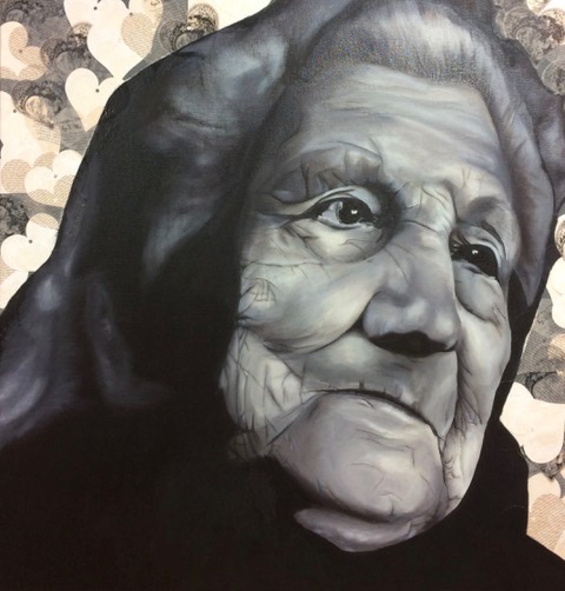 Grootportret Siciliaanse oude dame met achtergrond gemaakt van collage.
