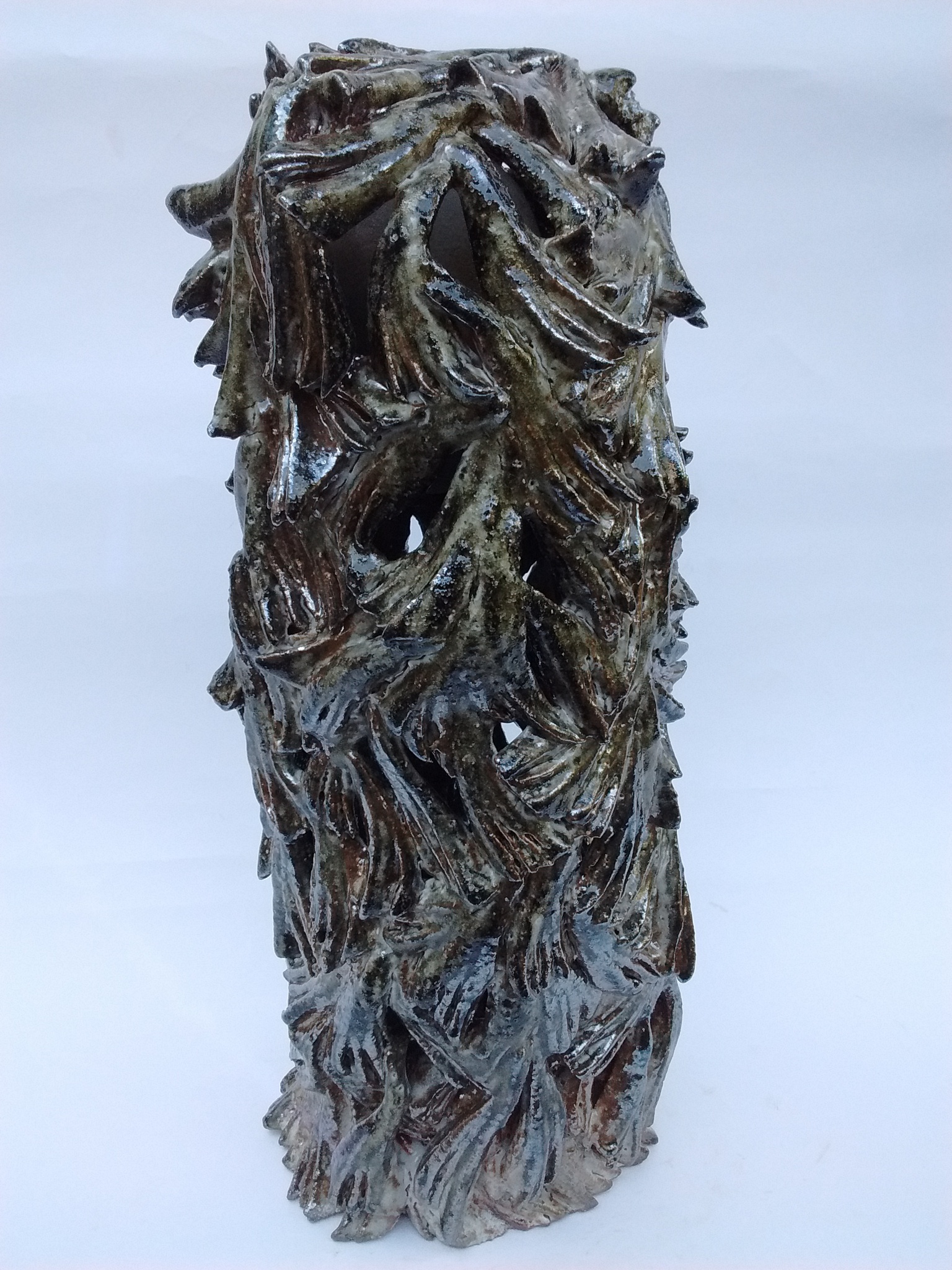 Zoektocht in keramiek: vrouwzijn in vloeiende lijnen en contouren; hoge dunne vaasvormen als weerspiegeling van een zoektocht naar identiteit...