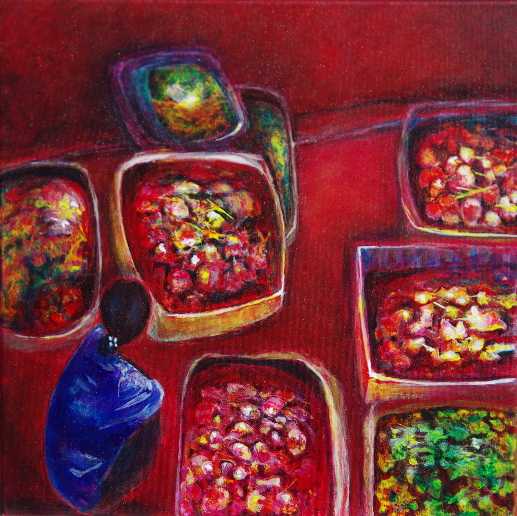 Dit werk toont de bijna sprookjesachtige, exotische sfeer waarin ik terecht kwam, lopende tussen de zittende vrouwen en mannen die, midden in de nacht, luid lachend en roepend hun waren aanprezen. Het was warm en donker...een heel bijzondere sfeer. Acryl op canvas 40x40 ingelijst.