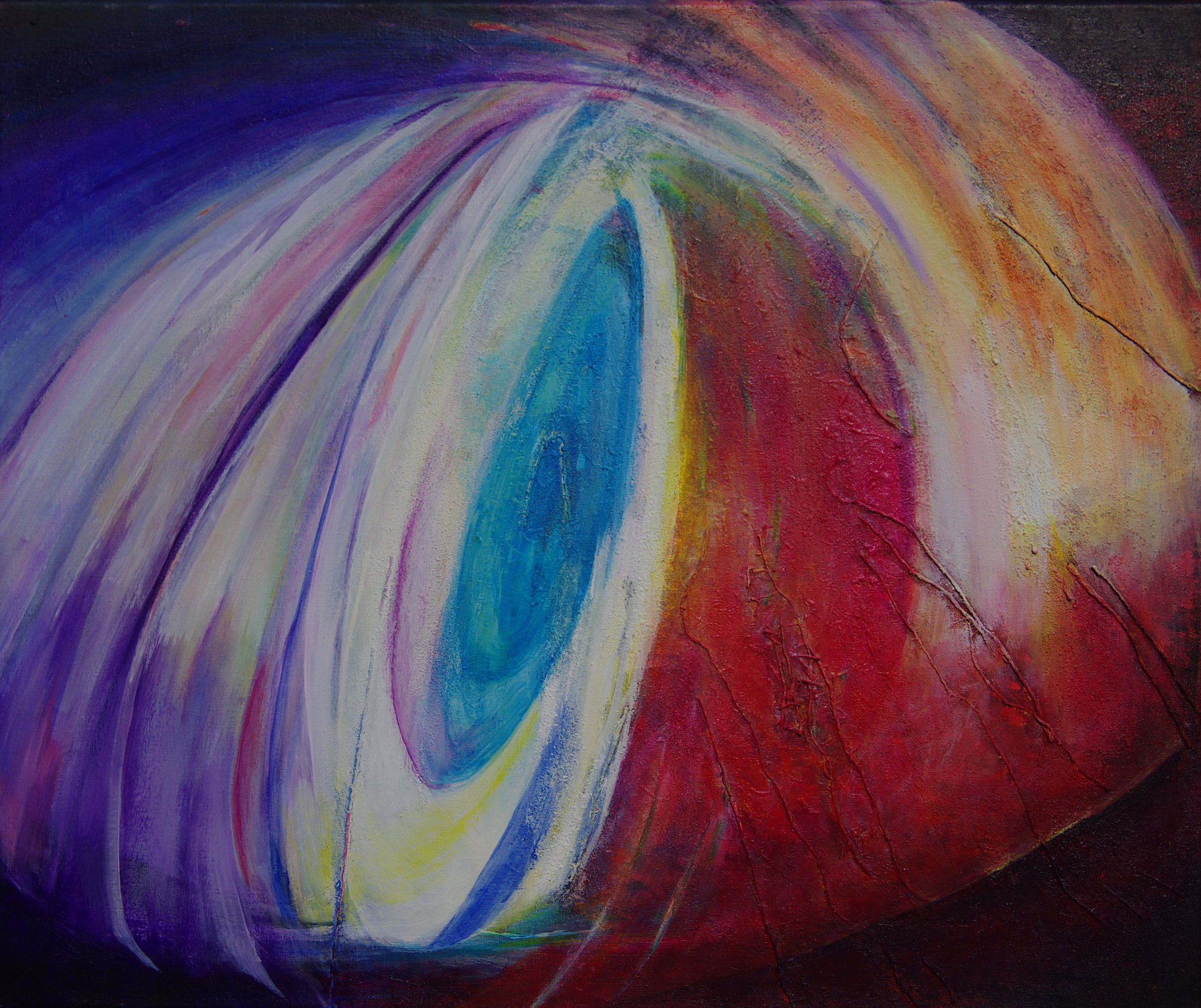 Met dit werk probeer ik de enorme energie uit te drukken waarmee ik mij soms op mijn werk 'moet' storten...Acryl mixed media 50x60 op doek ingelijst.