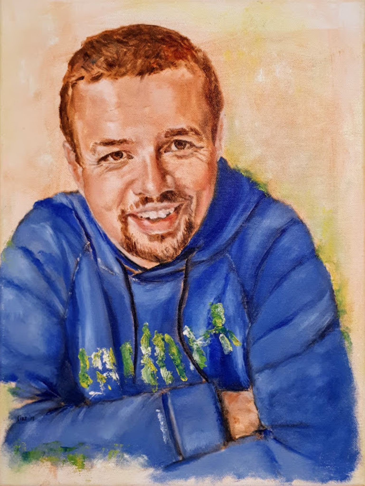 Dit werk maakte ik voor onze jongste zoon. Op zoek naar zijn zo sprankelende, vibrerende wezen kwam dit portret tot stand. Een bundeling van liefde en licht... mijn verjaardagscadeau voor hem. 50x40 olieverf op doek, ingelijst.