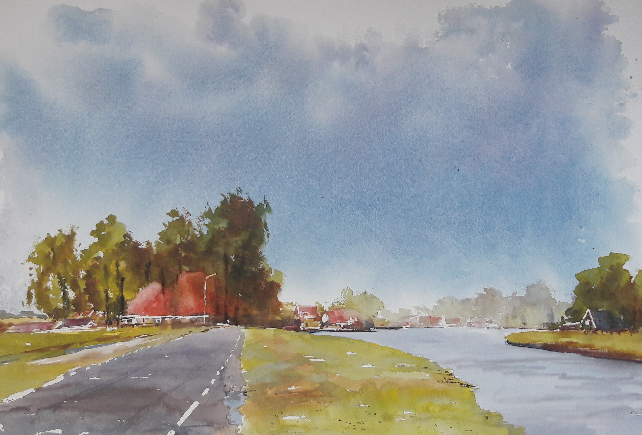 Realistische aquarellen en olieverf schilderijen van Hollands landschap, met altijd expressieve luchten boven de lage horizon zich spiegelend in de waterrijke polder. Ook werken uit de Franse Morvan en van de Oostelijke Algarve in Portugal.