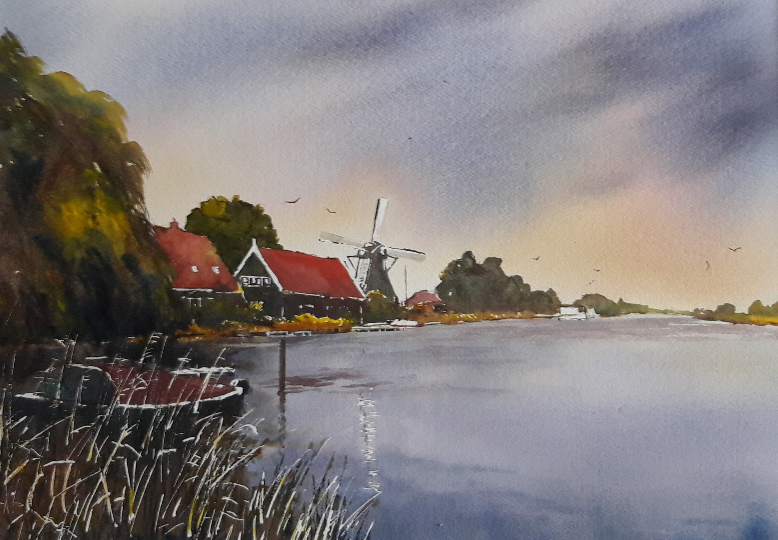 Realistische aquarellen en olieverf schilderijen van Hollands landschap, met altijd expressieve luchten boven de lage horizon zich spiegelend in de waterrijke polder. Ook werken uit de Franse Morvan en van de Oostelijke Algarve in Portugal.