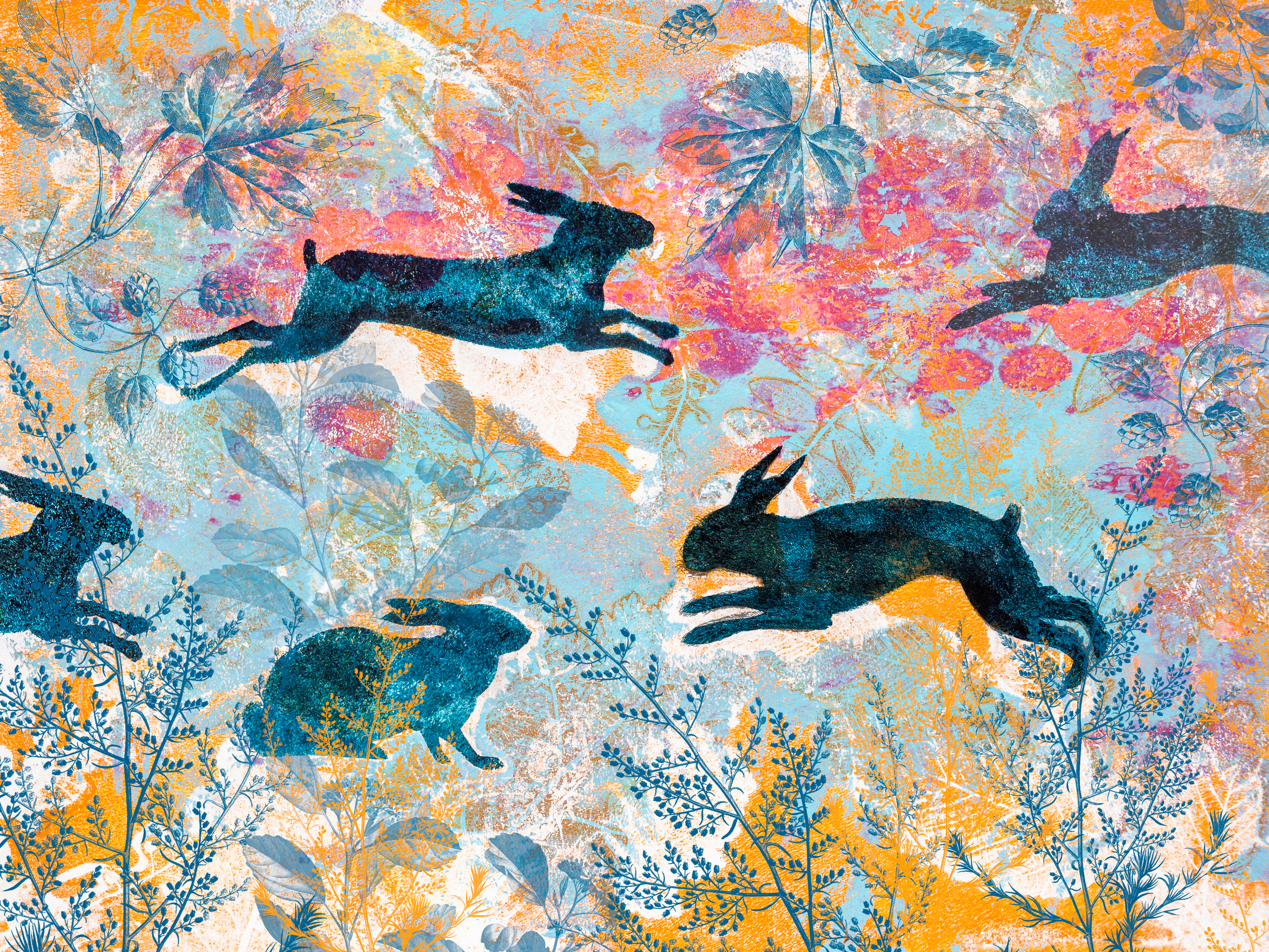 Haas Konijn Hazen Konijnen Waterschapsheuvel Monoprint Monotype Blauw Oranje Natuur Landschap