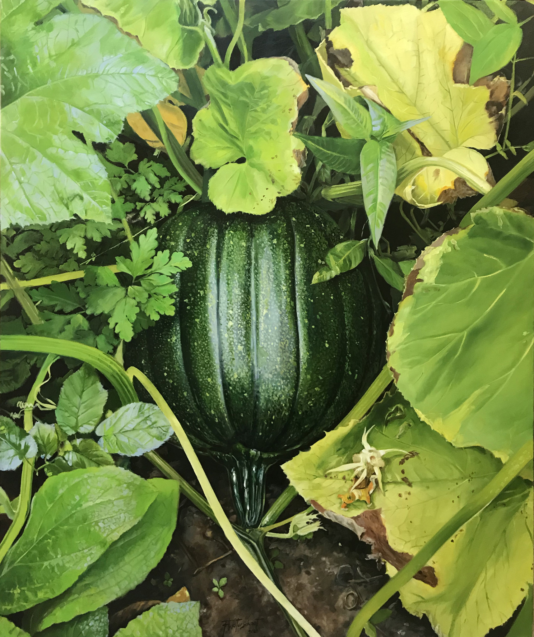 Pompoenen in eigen tuin, olieverf op canvas, 100 x 120 cm.