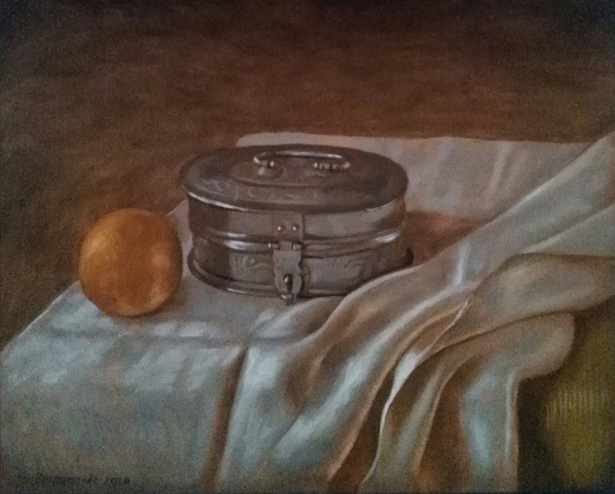 Stilleven met metalen doosje en sinaasappel