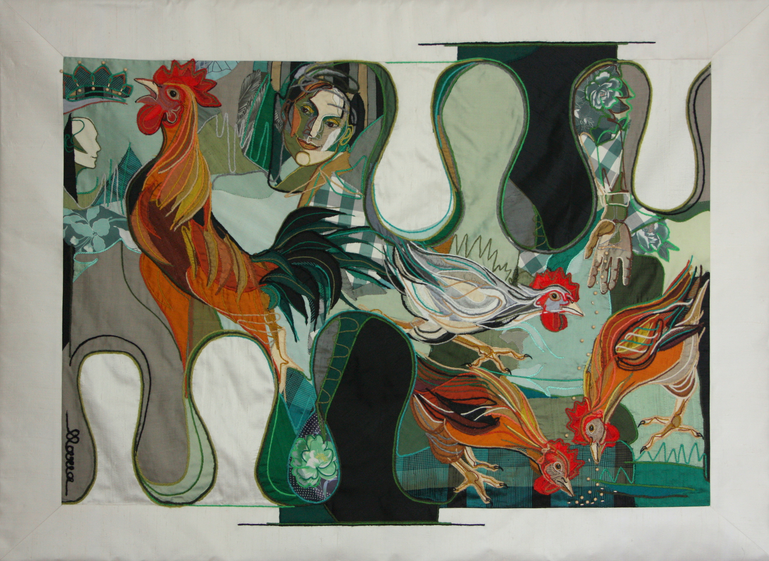 Serie puzzels. Het haantje dat Koning kraait, of haantje de voorste en als de kippen erbij zijn. textielobject in natuurzijde in applicatie techniek vast genaaid in de festonsteek opgewerkt met wollen draden om de "tekening" te benadrukken