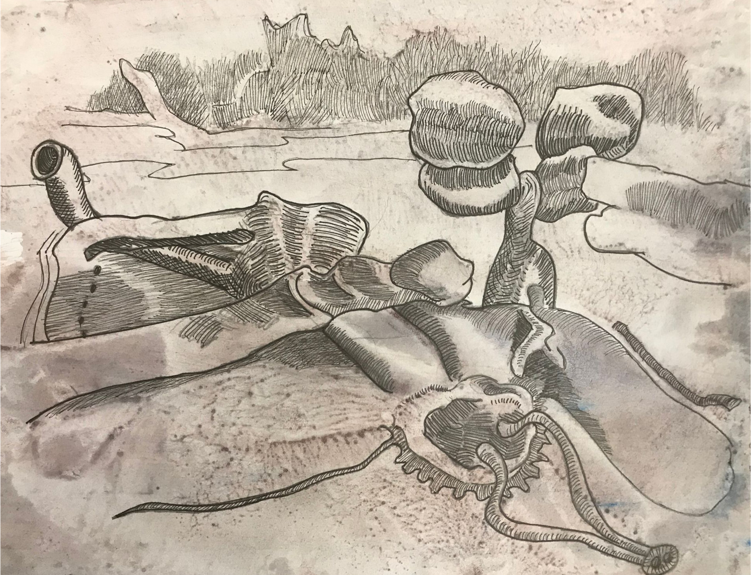 uit serie: JOURNAAL VAN NIET GEBEURDE ZAKEN, pentekeningen op geprepareerd papier, gescheurde randen