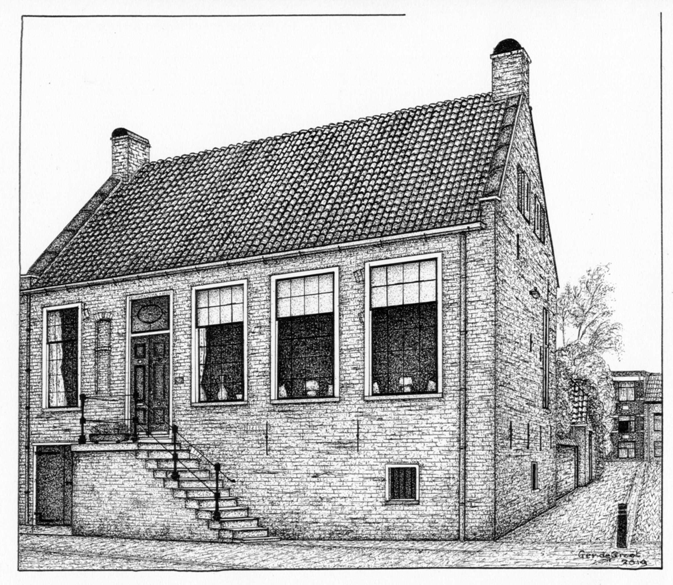 Ger de Groot, geboren 1941 in Hoorn, is autodidact. Hij maakt stippeltekeningen van monumenten in zijn geboorteplaats, van states in Friesland, van bijzondere panden in Brandenburg (Duitsland), maar ook van andere plekken in Europa die hij mooi vindt. hij werkt met zwarte inkt. Met een ragfijn pennetje zet hij de stippeltjes en streepjes inkt. Het resultaat is tekeningen van een verstilde sfeer.