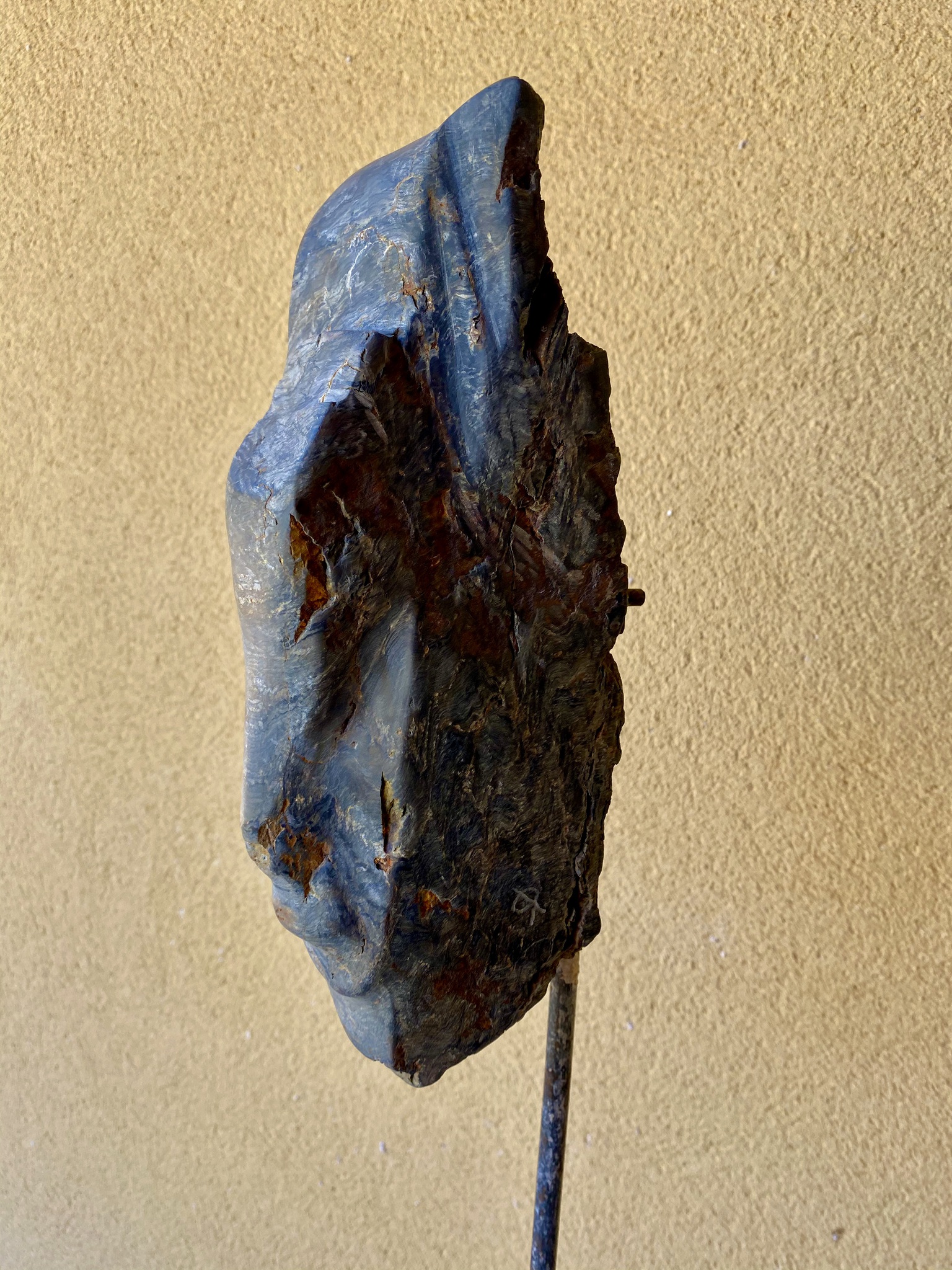 Figuratief gezicht van een heerser, Njord is de germaanse/Friese god van de Waddenzee, meren en rivieren. De steen is gelaagd, de kleuren komen van de verschllende metalen die in de steen aanwezig zijn ( koper, ijzer, ...), afkomstig van de oostkant van de Pyreneeën.