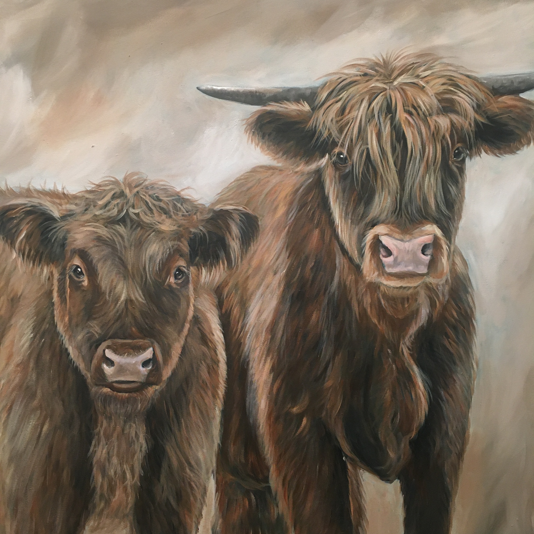 2 jonge schotse hooglanders geschilderd naar een foto van boswachter Lieke