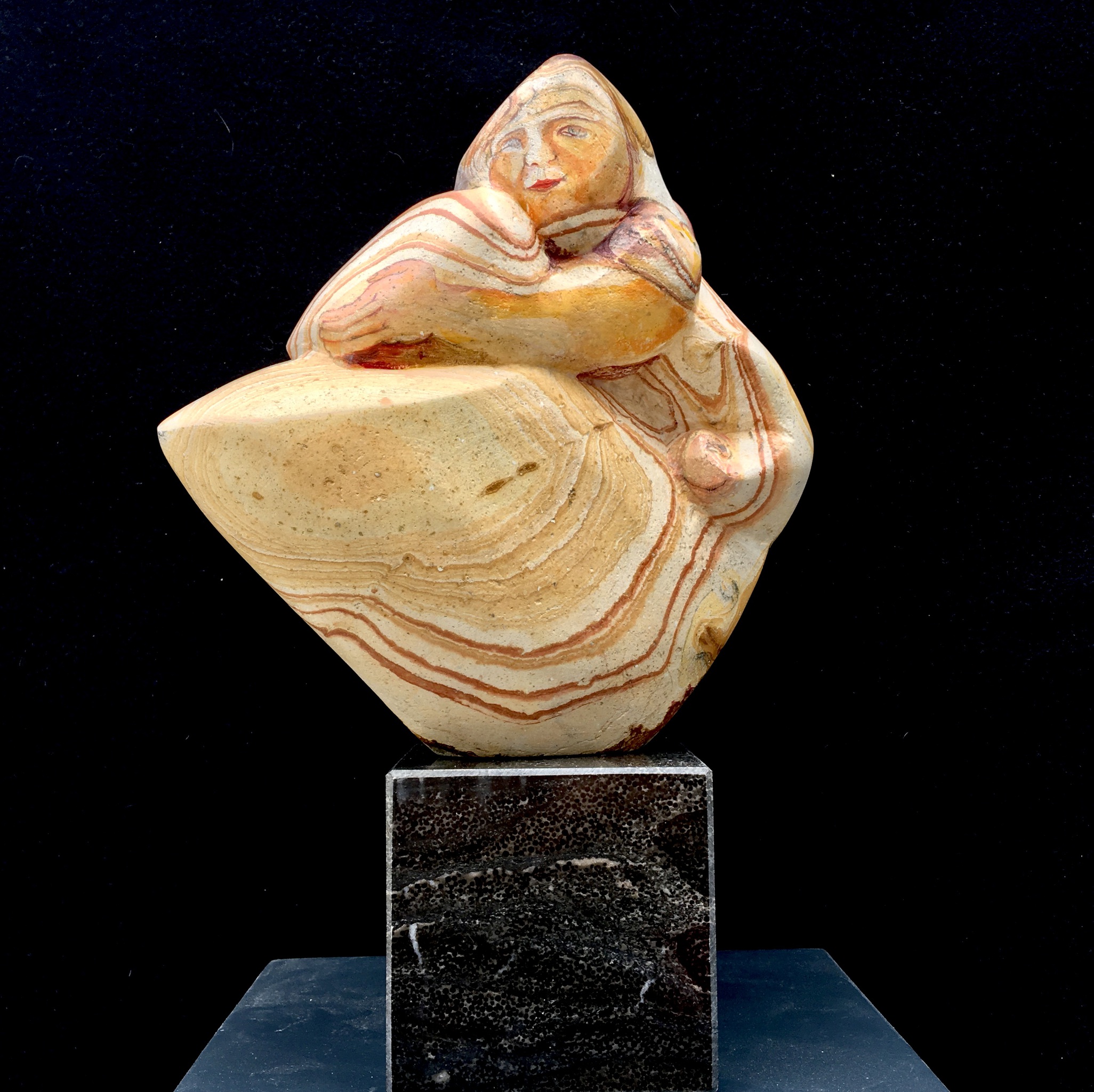 Een mooie combinatie van een beeld in steen met een beschildering, waar ik gebruik maak van de tekening en aders in de steen. Het wordt een surreëel geheel. Rainbow zandsteen.
